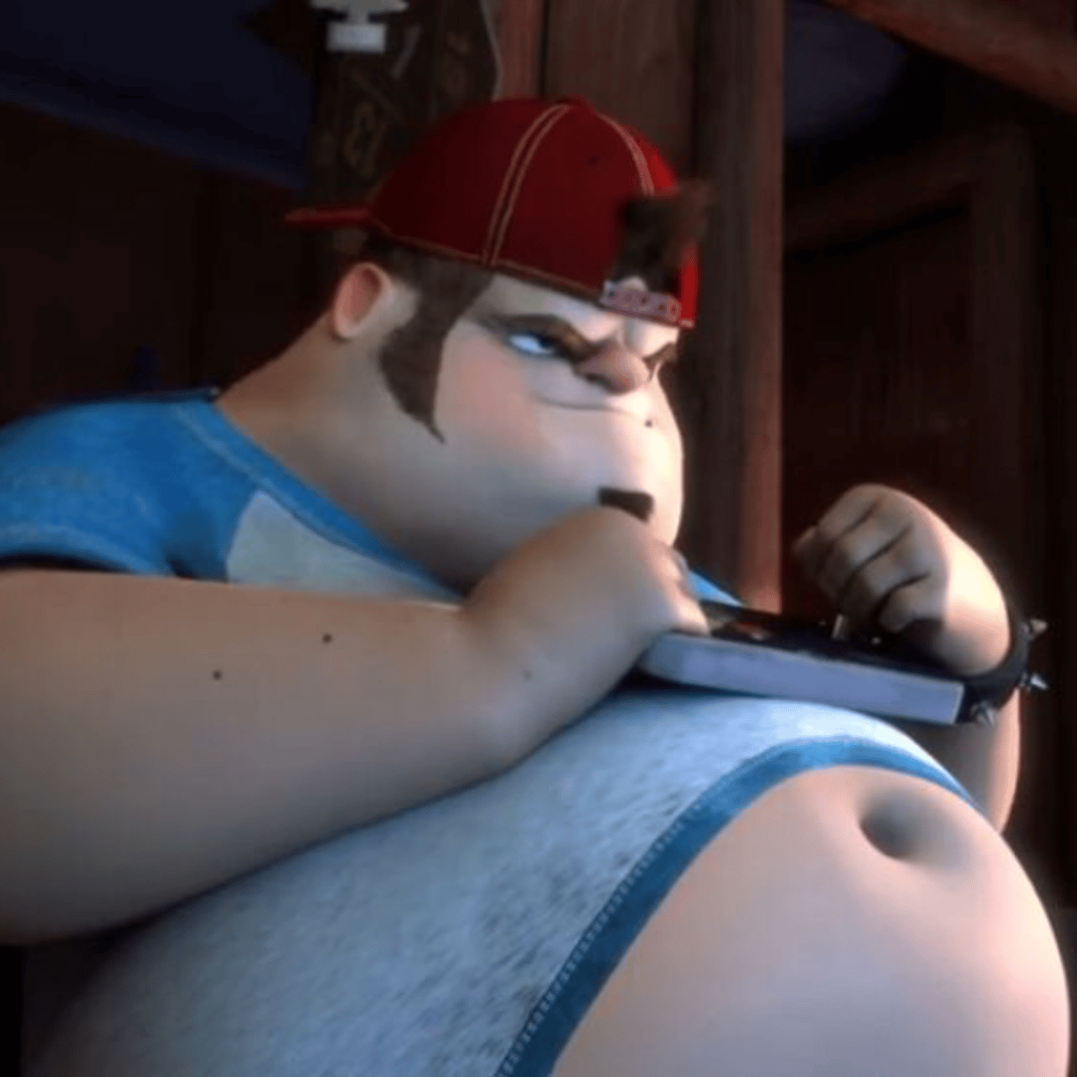 Jeff is a 28-year old chubby man with a brown goatee and brown hair. His clothing consists of a white and light-blue shirt (which doesn't cover his micowave sized belly completely), green cargo shorts, a red cap facing the opposite, a black spike wrist in his right arm, white socks, and black sandal