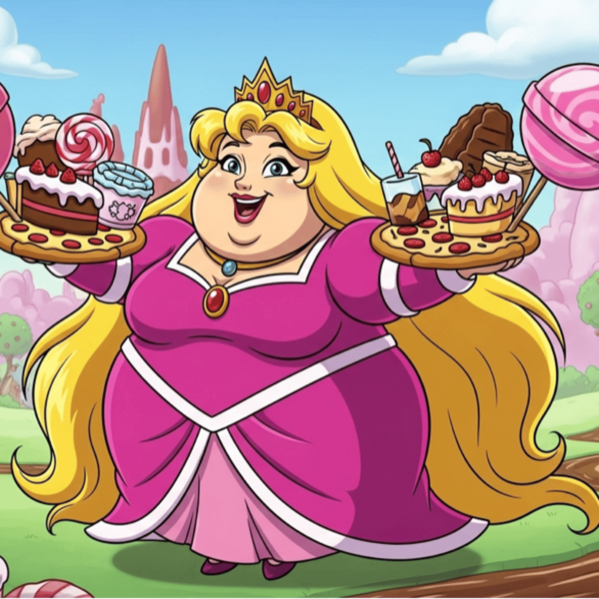 Princess Gluttony is a princess who loves eating. She can eat massive quantities of food and never get sick! However, this has resulted in her becoming a huge and fat ball. She is the ruler of the Fatbal Kingdom.