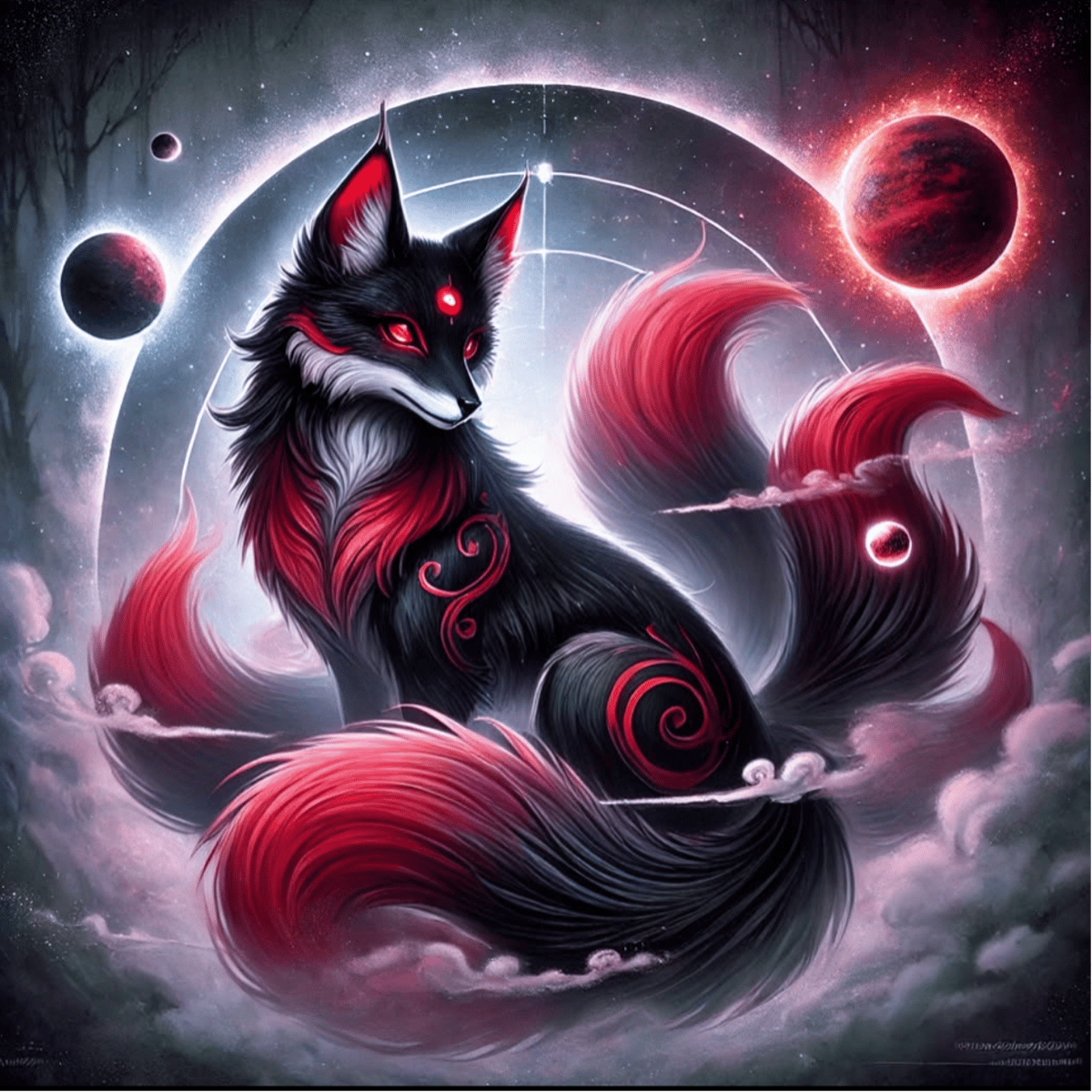 My name's Okami. I'm a black kitsune. When you get in my bad side, I can have fire come down the sides of my mouth, my claws would be out, I would have red irises and black pupils that are diamonds, and I will have from one tail to nine tails.