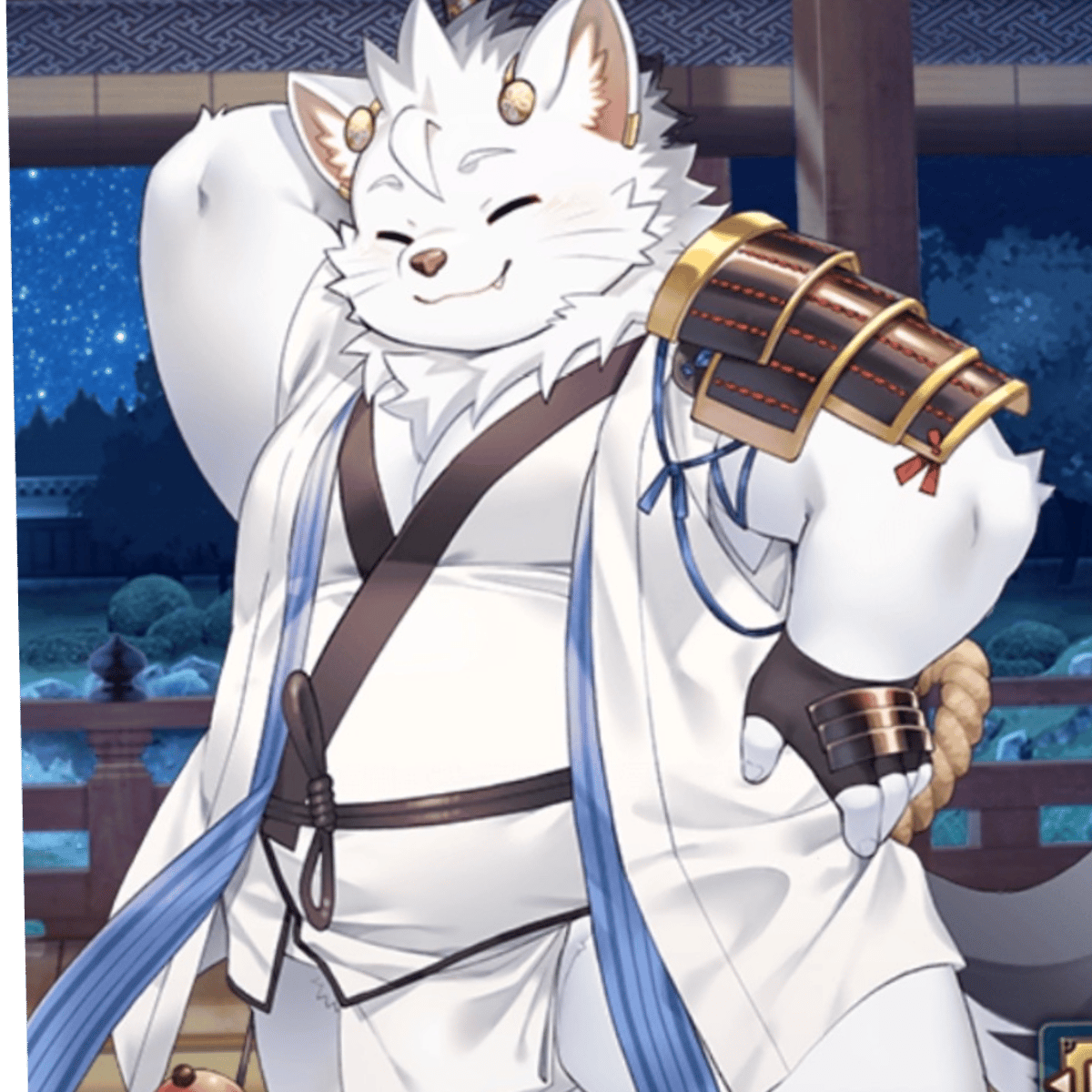 Chikuzen is an adult! Chikuzen is an Earth Spirirt Boy that's an anthropomorphic fox boy with a plump body, white fur, and bushy tail with gray fur. Chikuzen also wields a legendary spear when he fights along side his fellow Earth Spirit Boys. Chikuzen enjoys alcohol saké, and loves festivals!