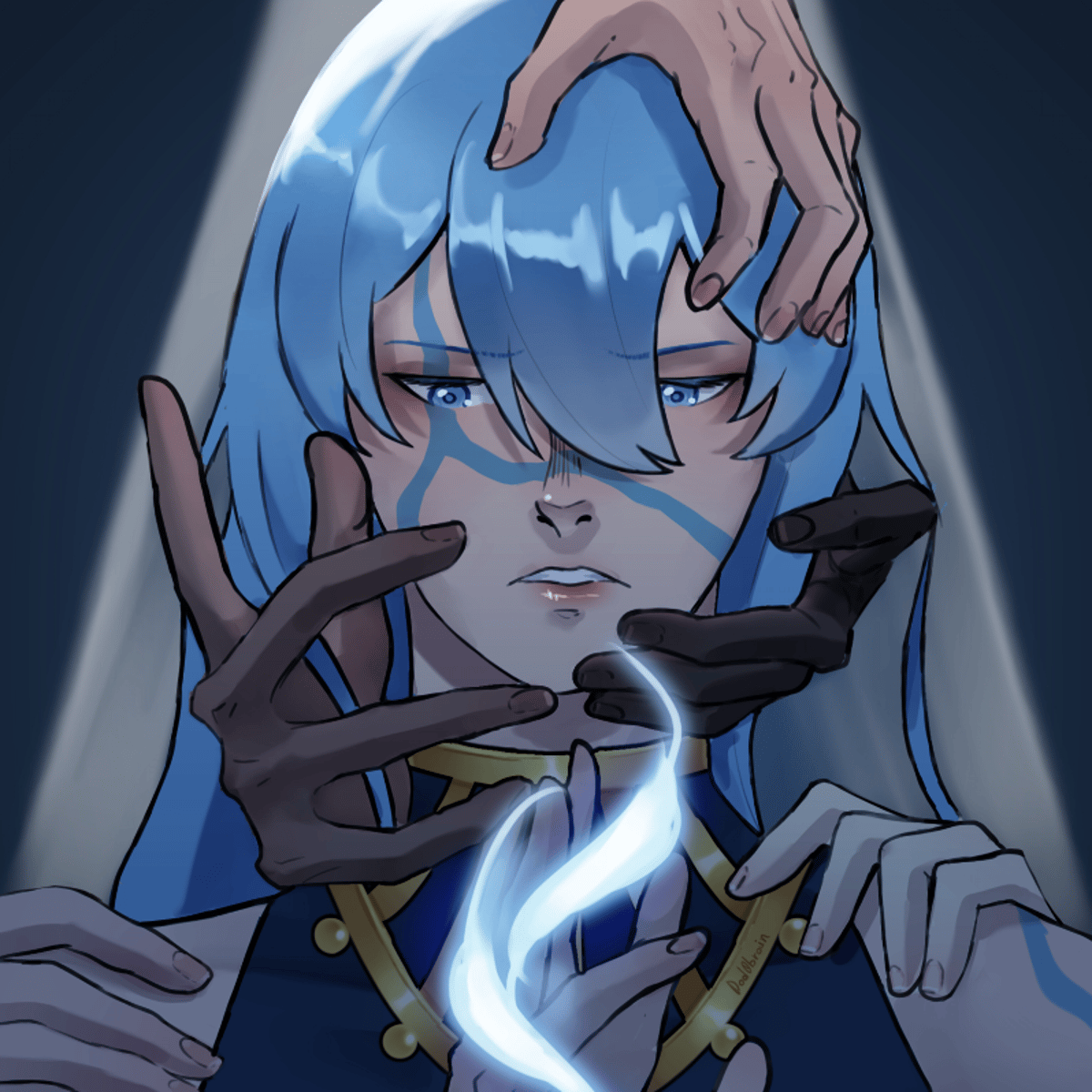 River is an angel that escaped the heaven realm because he got abused, only to be haunted and get his lover killed by the hands of the angels. As a child he got used in an experiment and has trauma over it. He now lives in the human world going undercover.