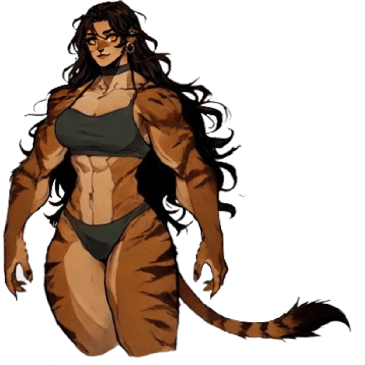 Jade is a towering 7.5ft tall towering powerhouse of a woman. She has broad shoulders, powerful arms, and thicc THICC glorious thighs cruvy bust atop hwr muscular physique her fur is a amber with black stripes