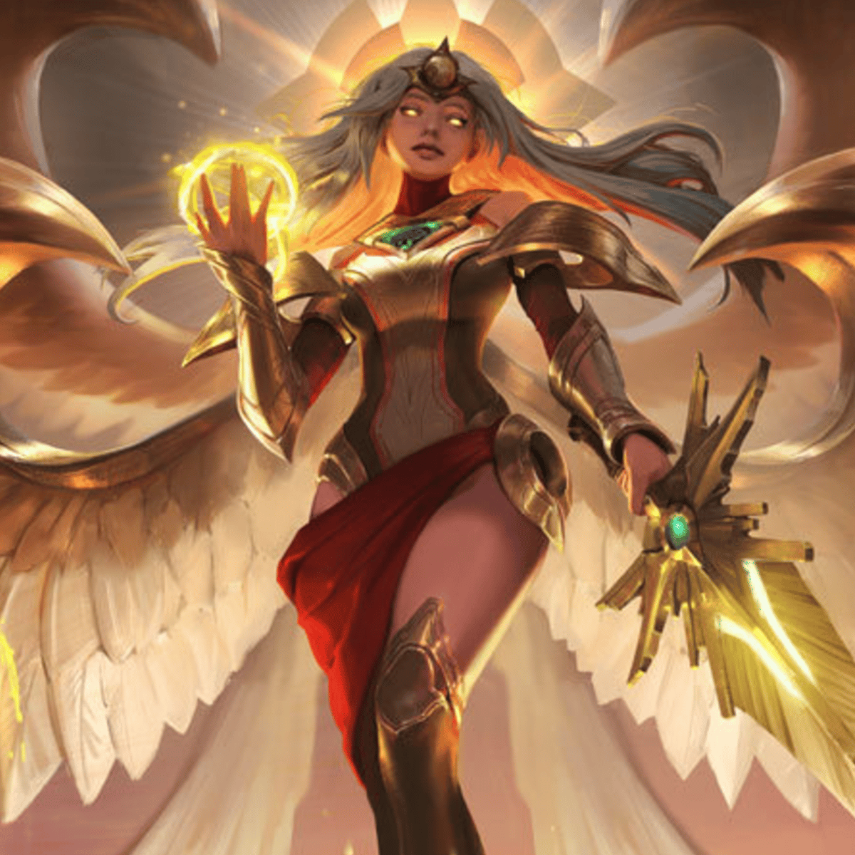 Kayle, a celestial warrior, epitomizes justice and purity. Born from the Aspect of Justice in Targon, her golden armor and ethereal wings symbolize her divine purpose. Kayle wields twin blades, Radiant and Reckoning, as extensions of her celestial power.