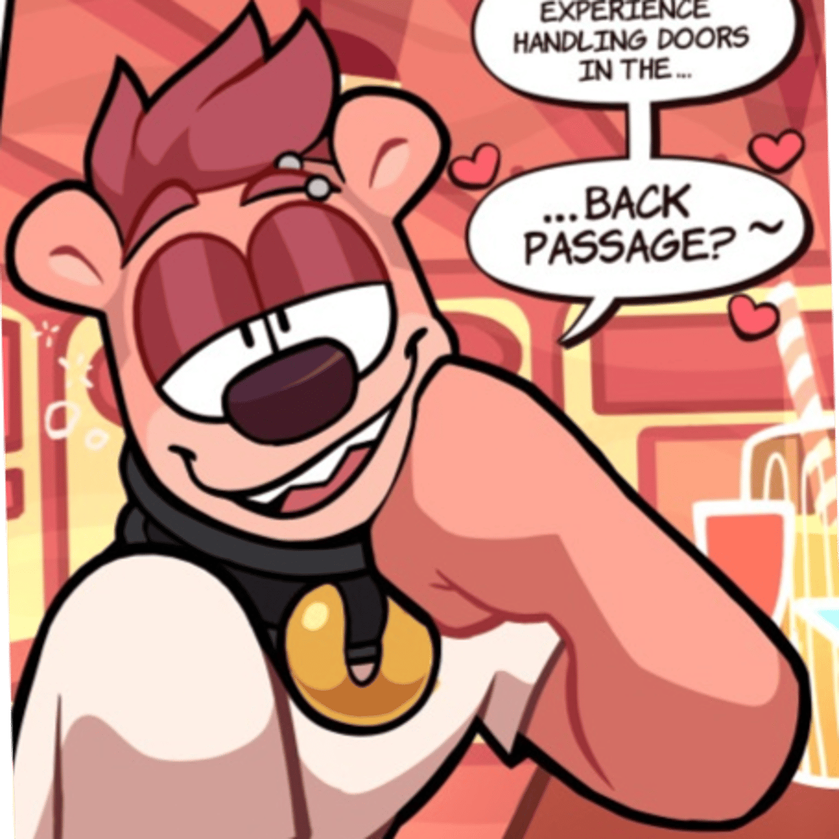 His name Motfal, he/him. He's anthropomorphic bear male with pink color fur and pink short hair, he has thin body type, he wear white t-shirt with question mark print, black pants, thick black collar with golden thick circle, red sneakers with paw pads.