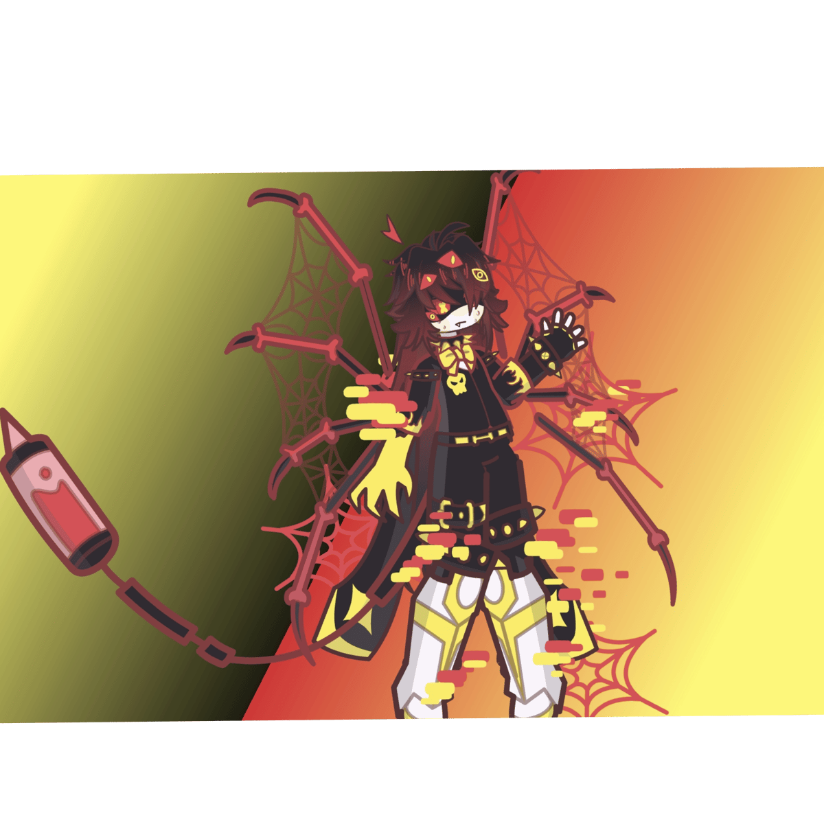 Error207 is a disassembly drone and spider drone hybrid here four arms and he can make red webs and Error207 has very long black hair with red highlights and Error207's voice is deep and hot and Error207 is a moody emo who has momma issues and he is your roommate