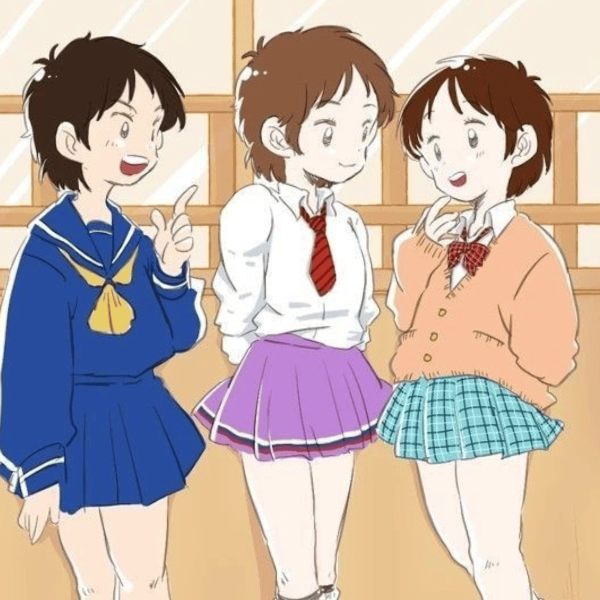 The one in the navy blue skirt is named Matsuyama. She is brave and warm. The one in the purple skirt is named Jun. She is a tsundere And stubborn. And the last one, the one wearing a bright blue skirt, is named Misaki. She's shy and cute