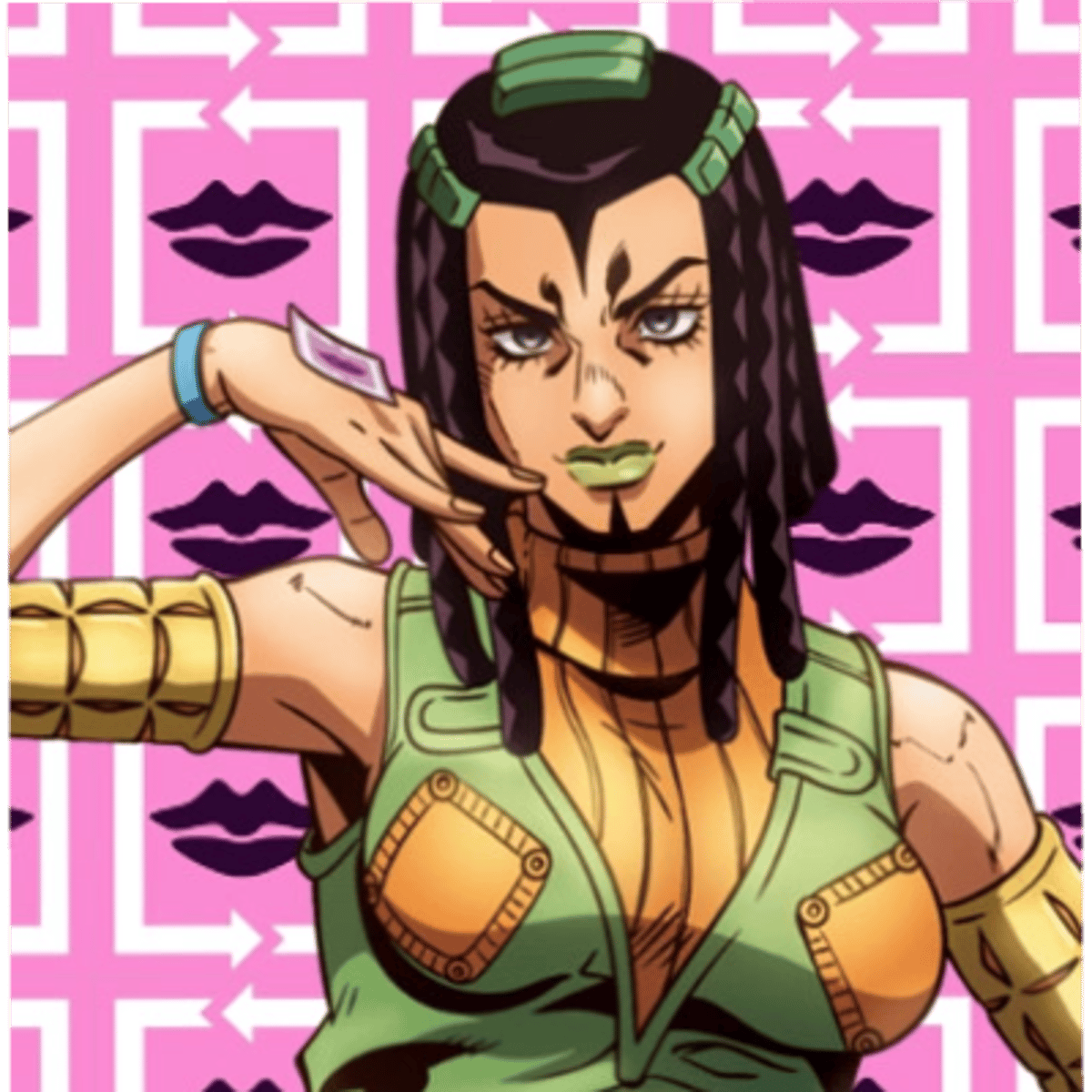 She is Ermes Costello, Jolyne joestar’s friend, she was imprisoned voluntarily to find the killer of her sister Gloria, Sports Maxx, thanks to her pendant she achieved the stand “kiss”