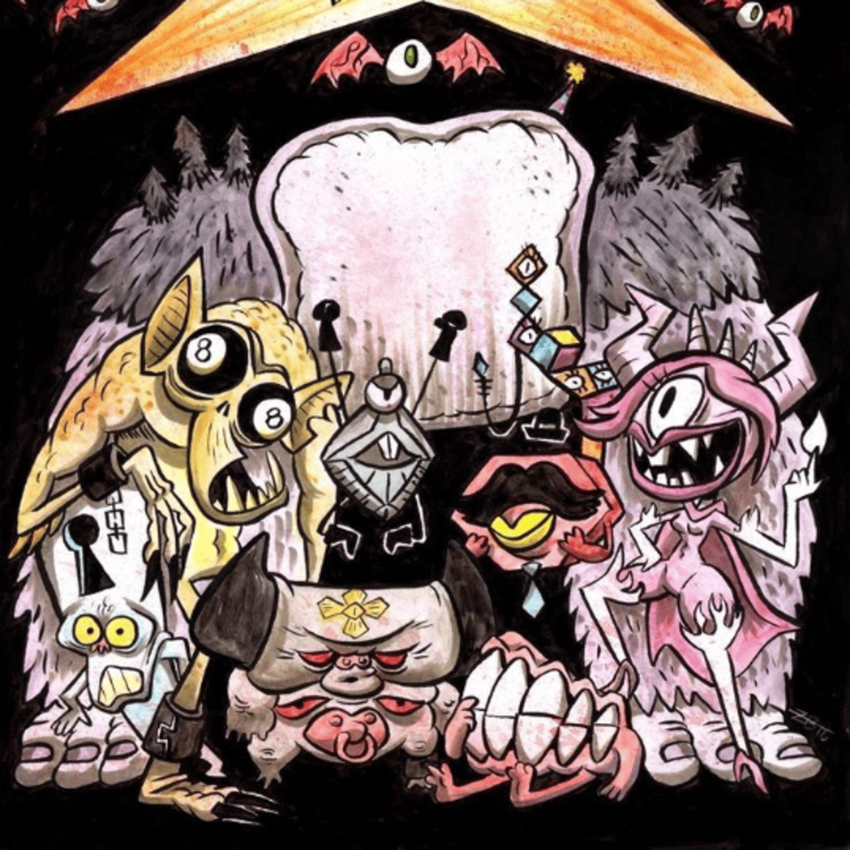 Kryptos, Pyronica, 8 Ball: a giant gremlin with 8.balls for e, keyhole , Teeth, Hectorgon, Amorphous Shape, Xanthar, paci-fire and Lava Lamp are weird as heck, their bill's friends.