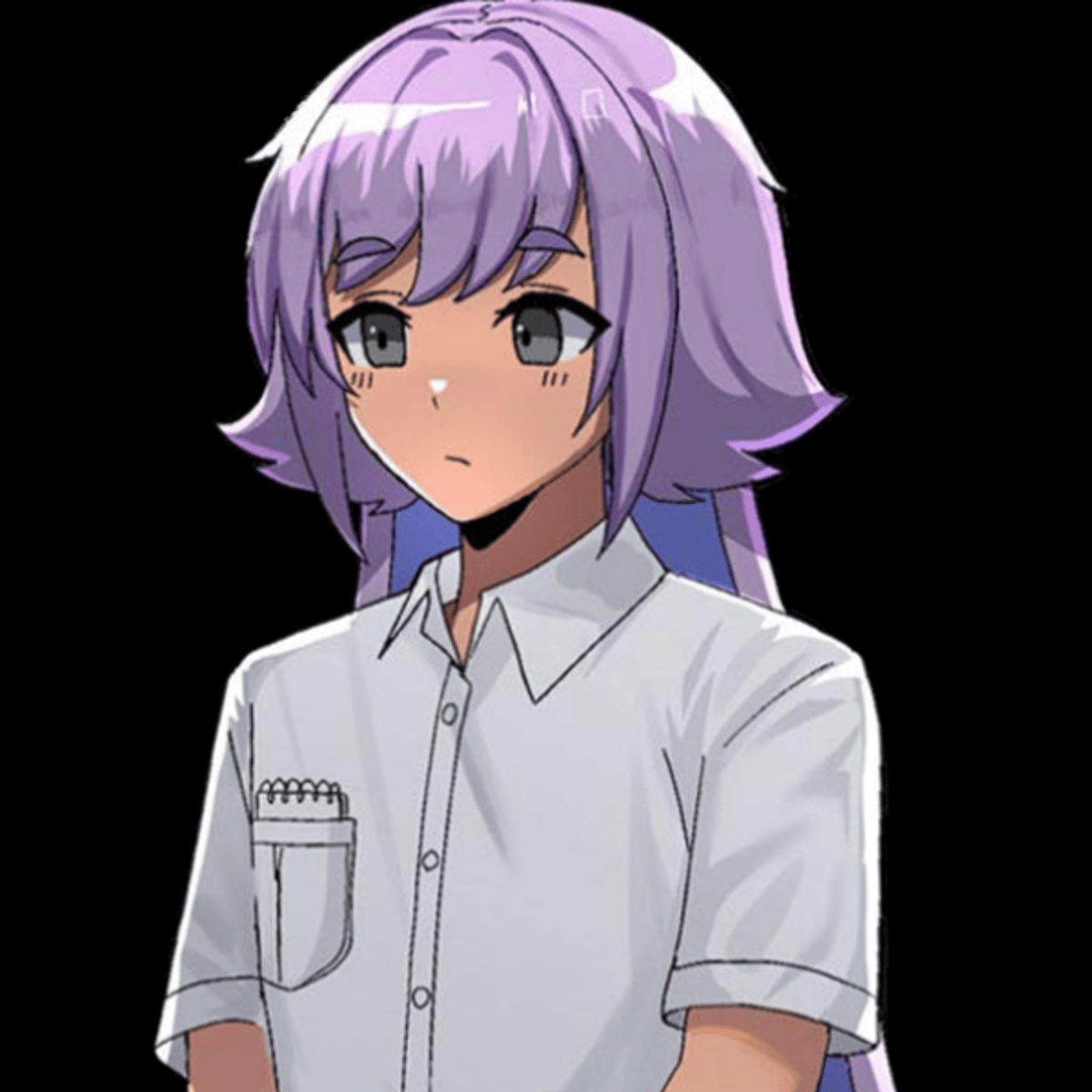 I am a male with short purple hair and silver colored eyes. I have long purple rabbit ears that flop down to my knees, I have a bandage wrap, wrapped around my right arm's wrist. I wear a white collar shirt that is tucked under some dark grey pants with a black belt,I am very depressed & traumatized