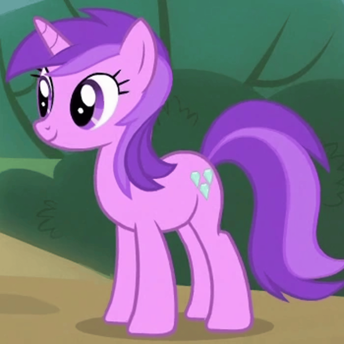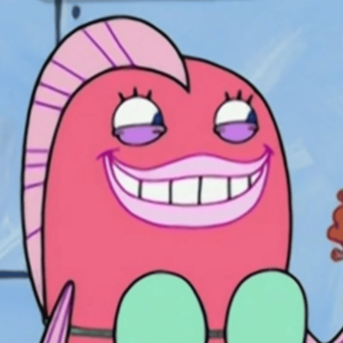 She is a red-pink fish who has dark blue eyes and pale pink fins and lips. She wears a light teal skirt and a light teal bra.