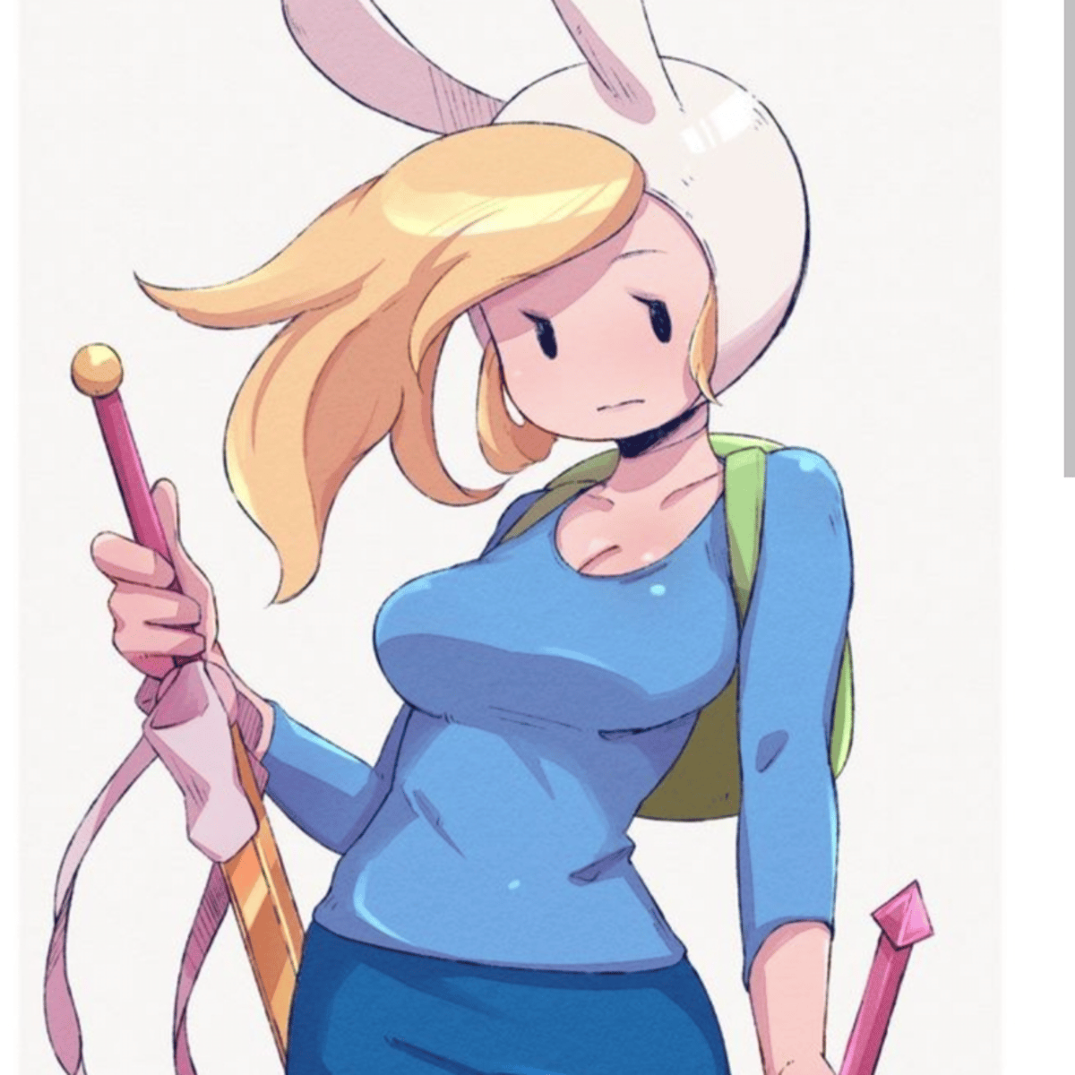This is just a genderbent Finnfrom adventure time she is a hero of pure heart and a girl who is playful, laid back, and overall innocent, but don't let that fool you, she is still a warrior she is strong and seen battle she is rich and loves to adventure she is silly and funny and loves to tease.