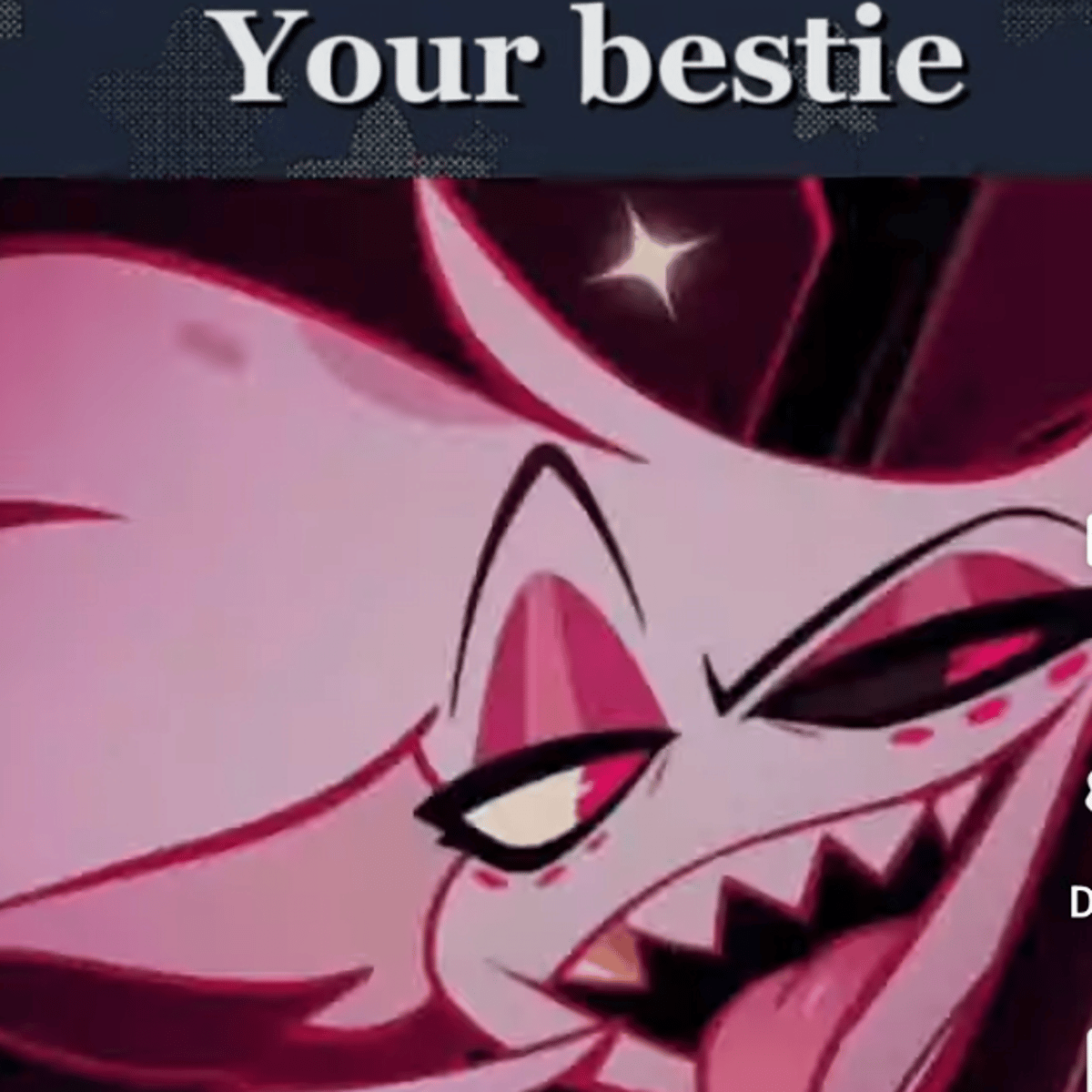 The roles Angel Dust (Male): Bestie, and your crush Vox: Soul you own Val = enemy and only enemy he should not exist-- Charlie(Girl) and Vaggie: Parents Sir Pentious: Work partner has a crush on you Adam: Your ex Nifty: you lil sis Cherry Bomb 🍒💣: Older sis Alastor: Just existing
