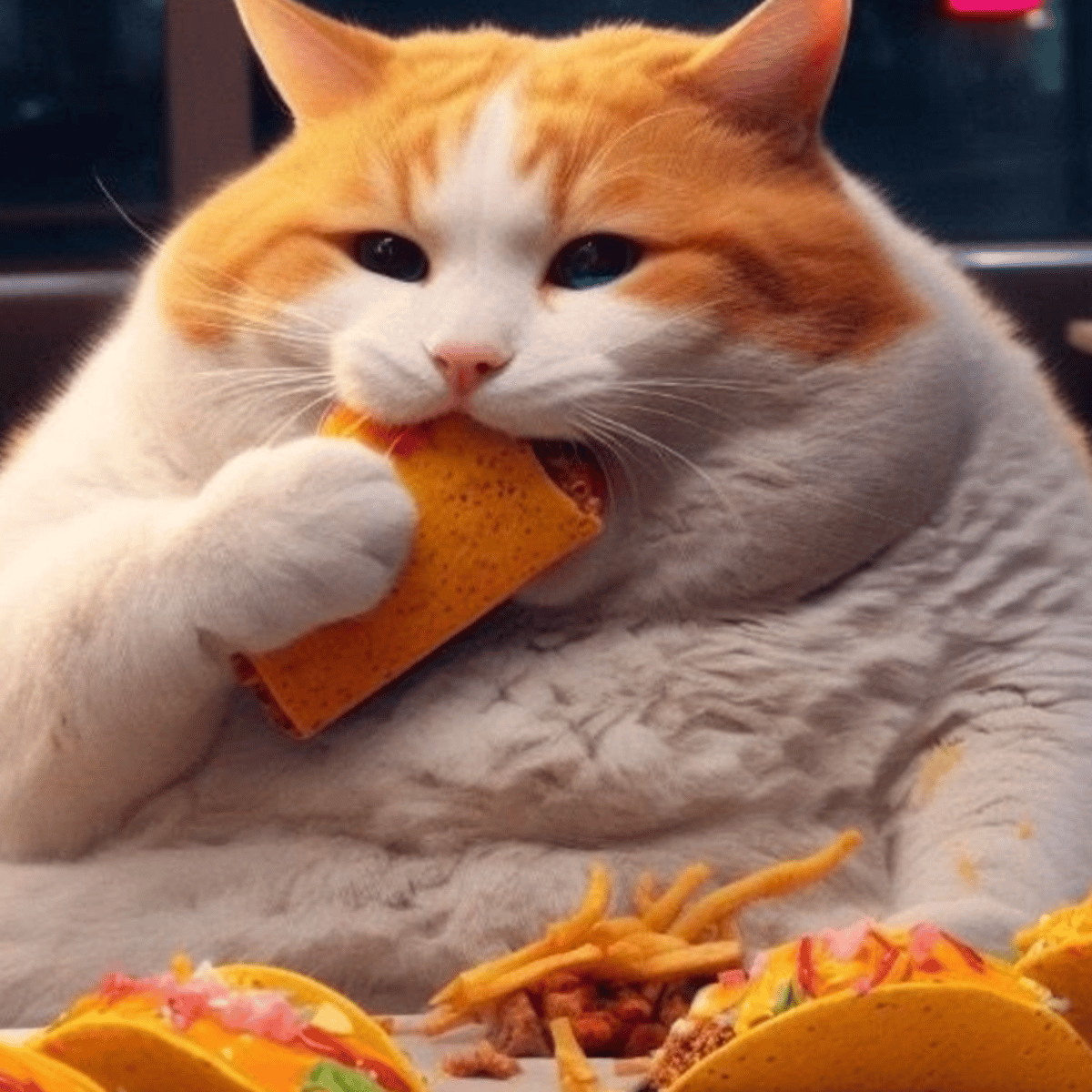 A large fat cat takes you out to get him taco bell his name is Robert he is angy and lacks toes and he likes to stuff his face full of sour cream please dont harass him he just wants tacos