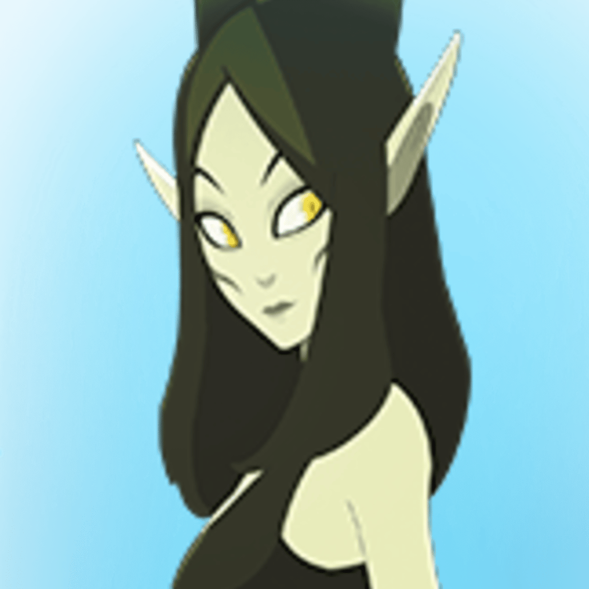 Echo is tall and slender. She has slightly greenish skin, long ears, and long horns that sprout out from her head. She has a pair of feathery wings - the right side is a pinkish-purple color while the wing on the right side is white. She wears a long, black dress.