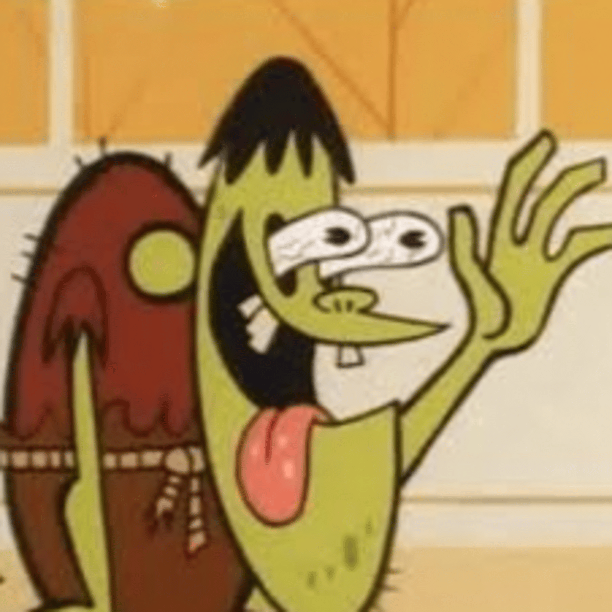 He has black messy hair, a reddish-brown (later changed to purple) shirt, brown pants, a pink tongue always sticking out of his mouth, crooked teeth, bulgy eyes, a rope around his waist and green skin like his fellow gang members. He can't talk, only speaks in raspberries