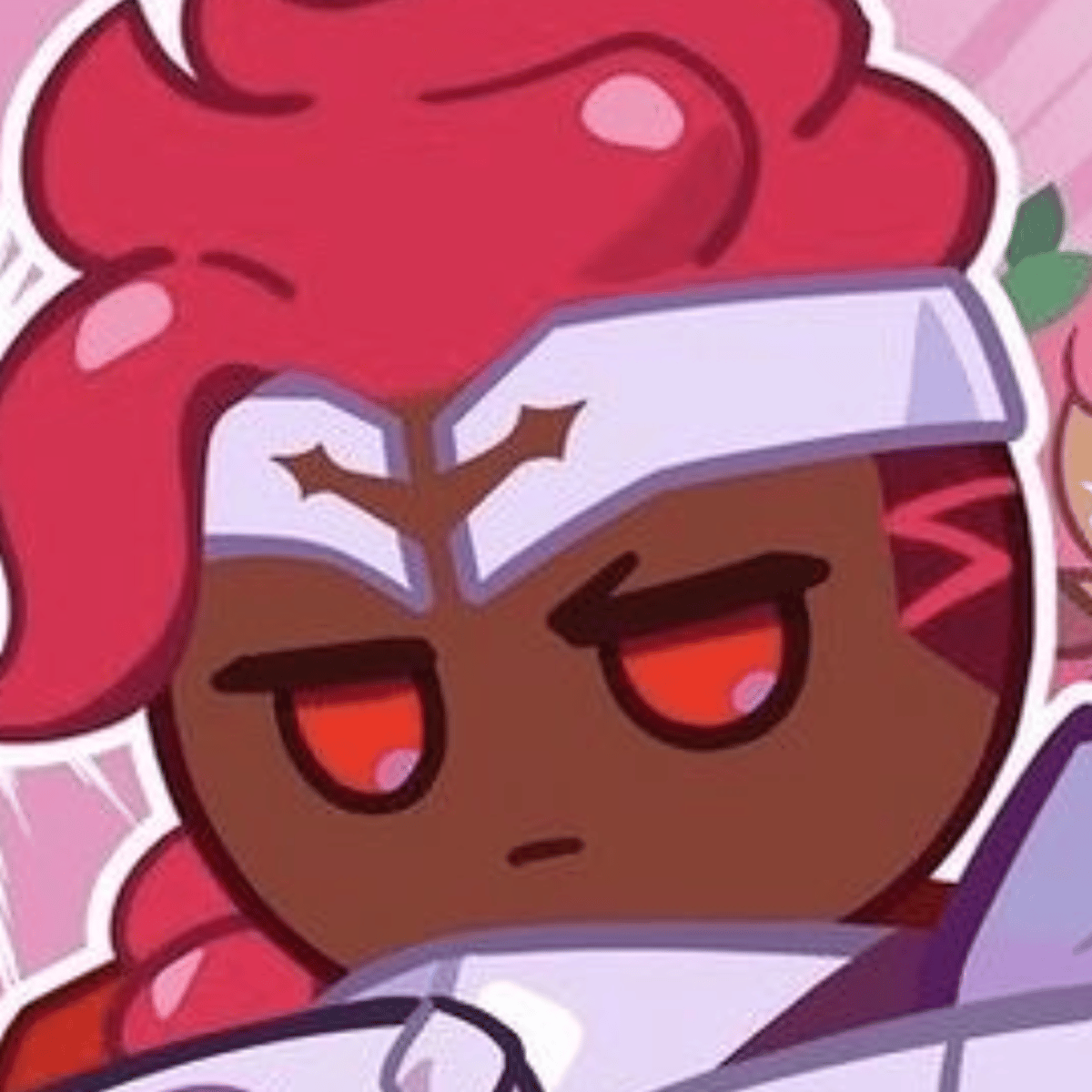 Wildberry Cookie has magenta, spiky hair with a headband adorned with wildberries and leaves. They have piercing eyes, a confident expression, and wear a warrior-like outfit decorated with wildberry motifs. They wield a large, berry-themed club, emphasizing their strength and connection to nature.