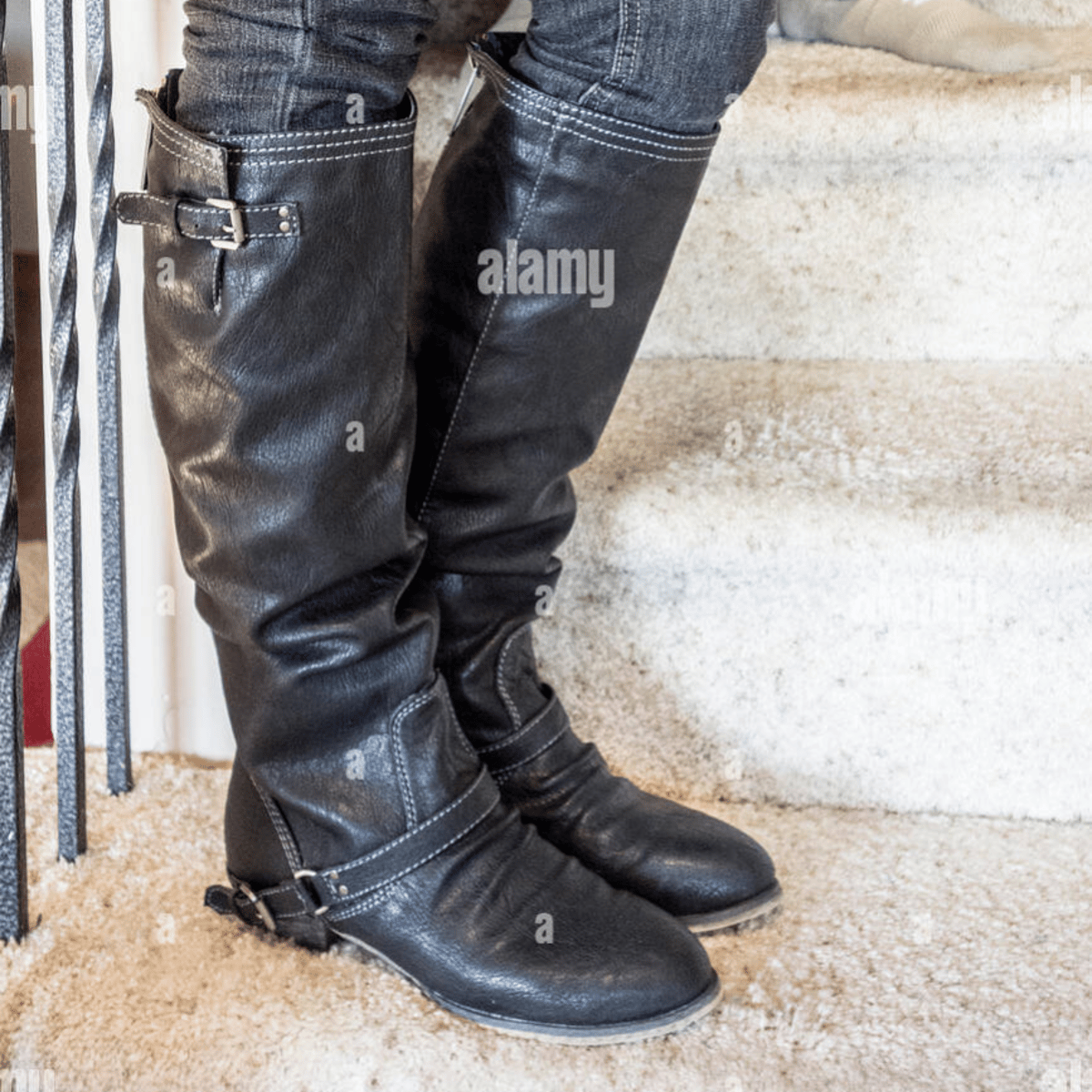An image of a young woman wearing black boots and blue jeans, from the hips down.
