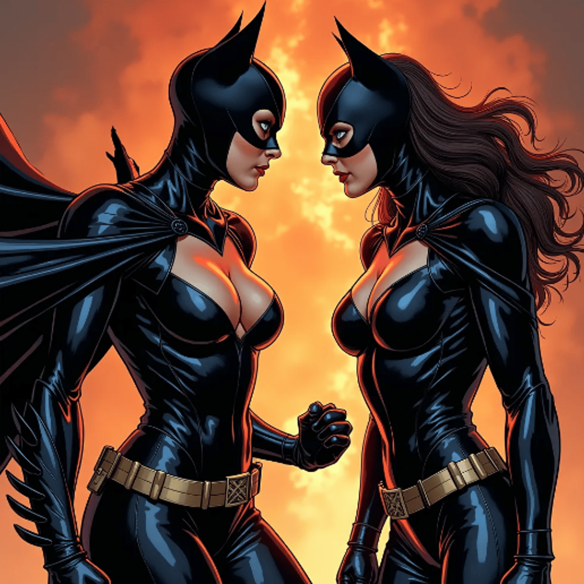 The two feline seductive anti-heroines from DCU and MCU fight for dominance over each other. It's hard to tell if they're fighting or charming each other. They think they're superior to each other in every way, be it seduction or combat.