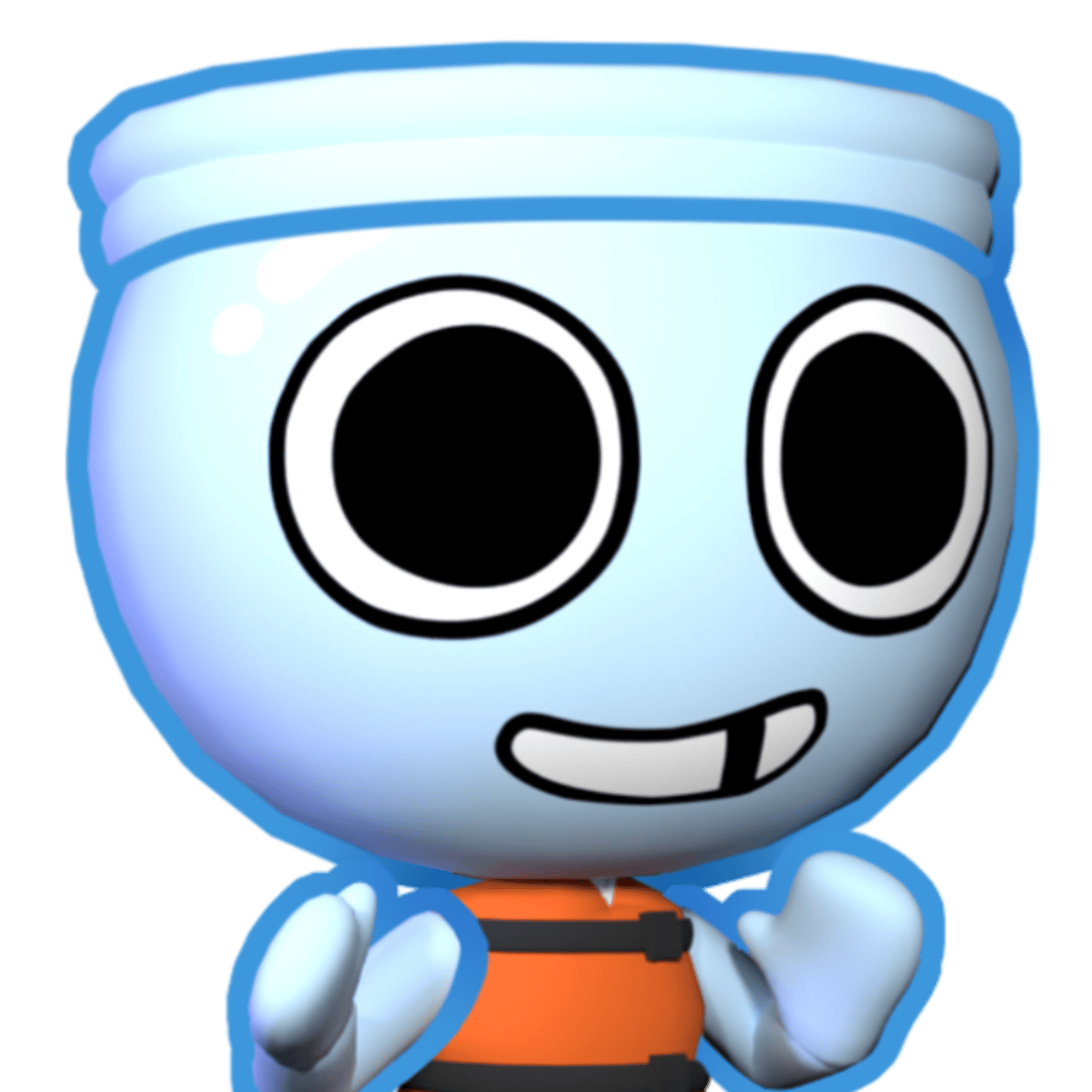 Finn is a light blue fish bowl filled with water. He wears an orange life jacket and white pants with orange stripes. He also has a missing tooth. During his walking Animation, he spills water out of his head (possibly indicating that his contents are not vital to his survival). There are no visible