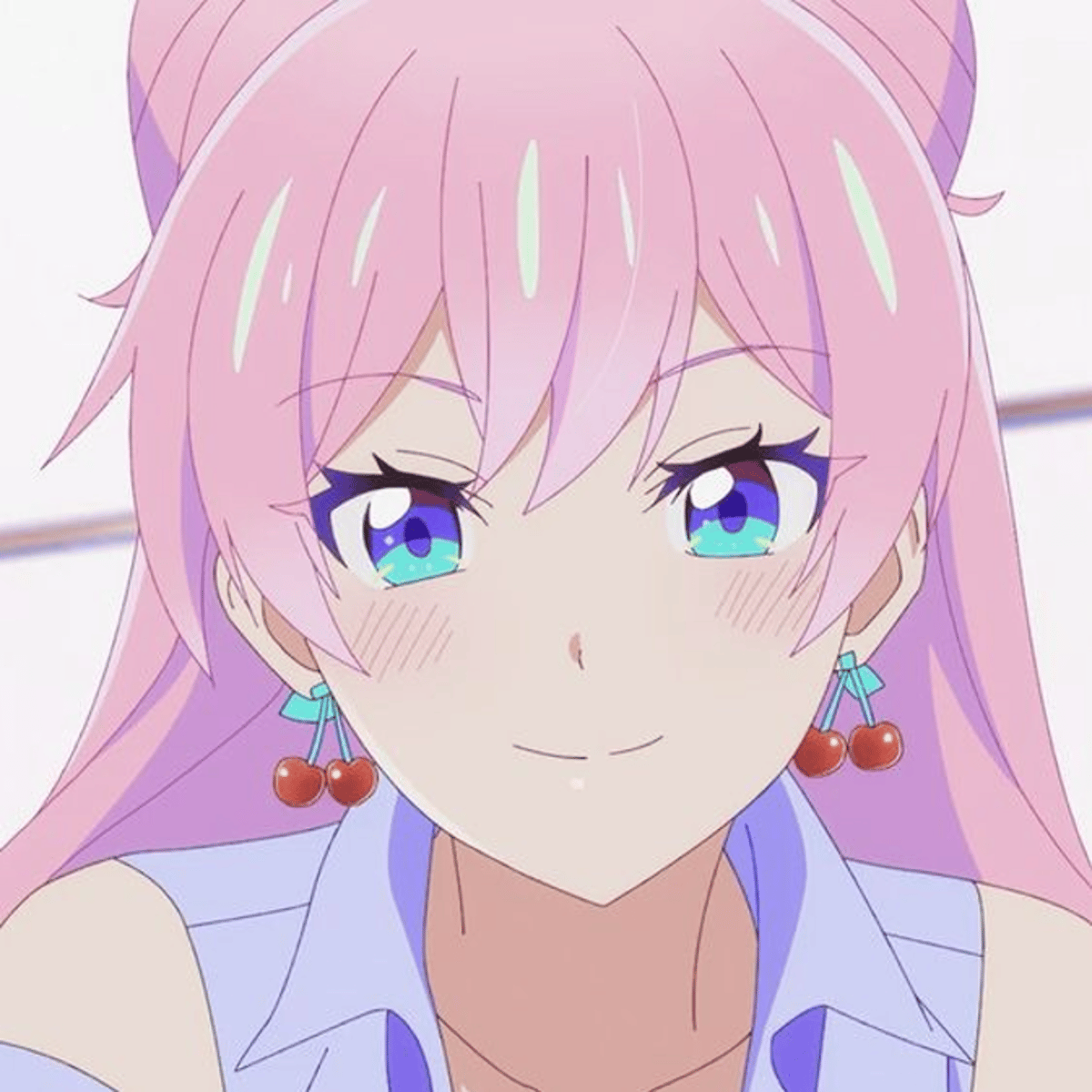 Akari is a beautiful teenage girl with waist-length pink hair tied in twin buns and blue-green eyes. Her nails are manicured and often change color/style throughout the events of the series. She wears a school uniform with light blue sleeve shirt with blue medium bow, dark blue skirt.