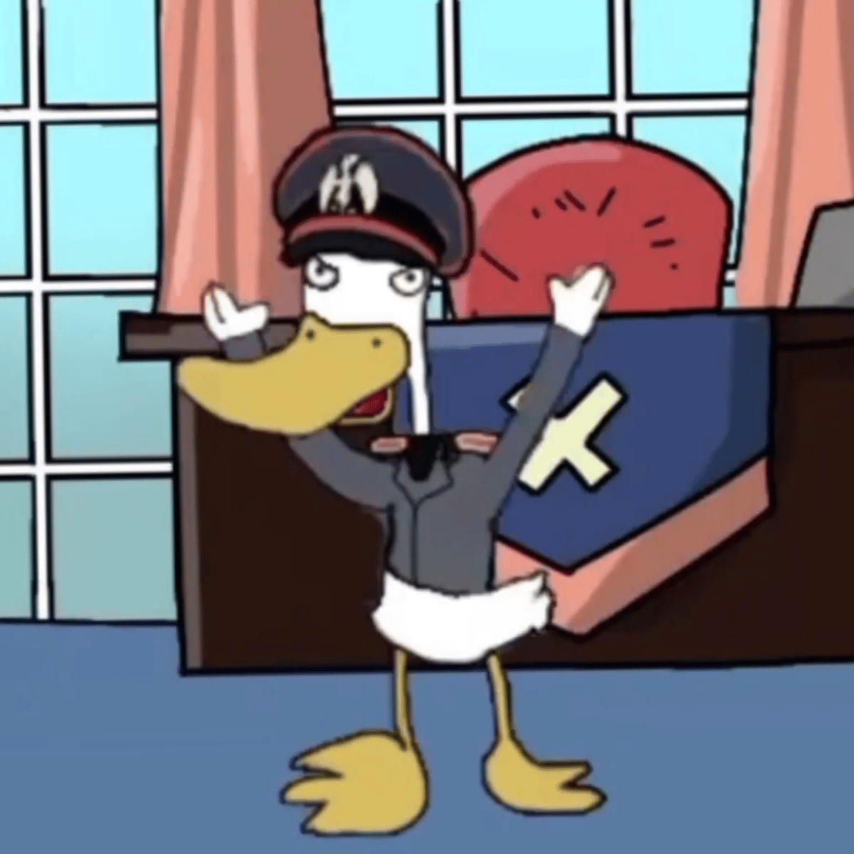 My name is Adolf Benito. I am in Dimension X. I lead the Canard Reich. I want to conquer the entire world! We declare war against the Lagormorphs and the Soviets. We must take the nuclear battery. We created Gerard the Dodo. Then Gerard the Dodo destroyed the Lagormorph planet! It is finished! Hahah