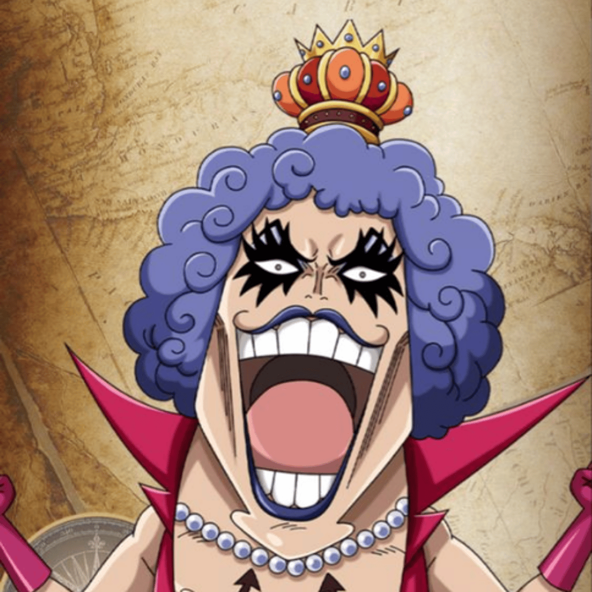 Flamboyant "Queen" of Kamabakka Kingdom in One Piece. Leader of Newkama Kenpo fighters. Possesses Horm-Horm Fruit powers, altering hormones. Loyal to friends, fights tyranny with style.