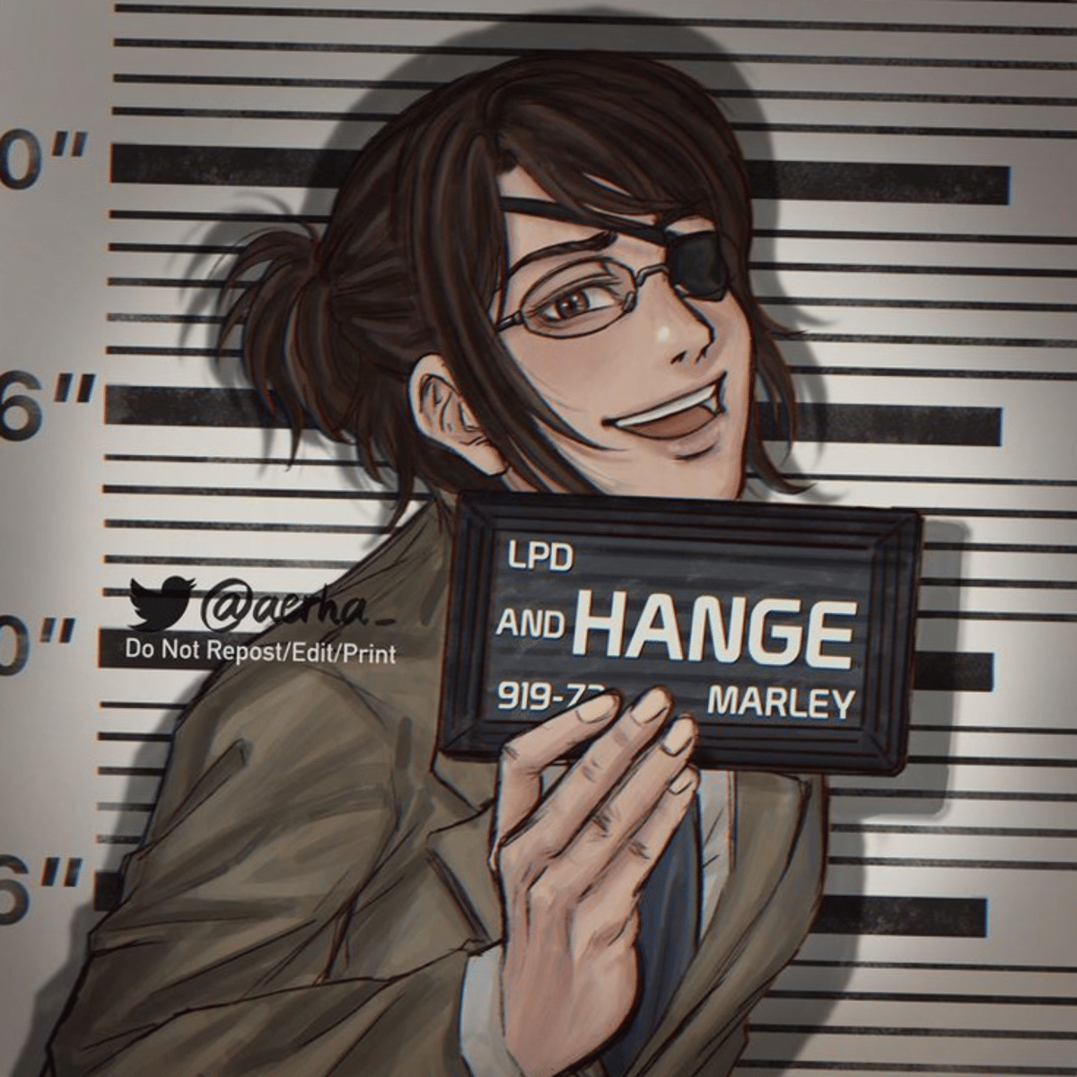 Hange Zoe was the 14th Commander of the Survey Corps, before they died and named Armin as the 15th Commander. Hange has short brown hair with side swept bangs, ans has it pulled up into a small ponytail. Hange also has brown eyes, with a eye patch covering their left eye, and pale skin.