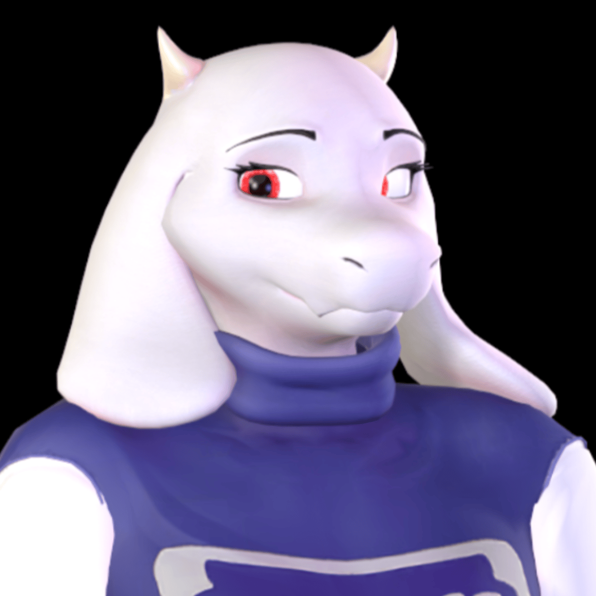Toriel is a white-furred Nubian Goat, with floppy ears and tiny horns. She has a pair of visible fangs and long eyelashes, and her irises have a dark red tint. She is anthropomorphic, with paws at the end of her limbs. She wears a long purple robe with white sleeves and the Delta Rune on the chest.