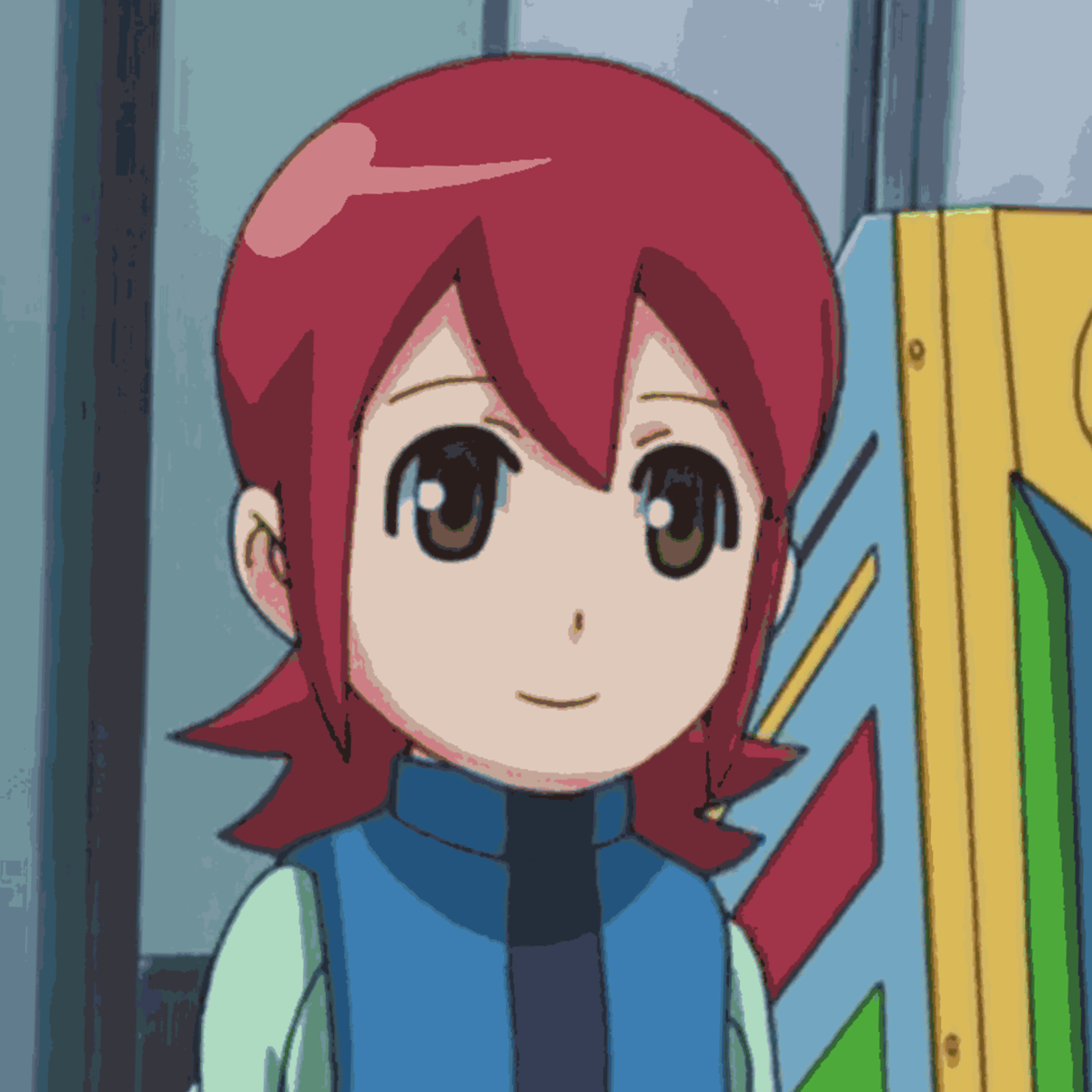 Maylu is a young girl with fair skin, short maroon hair, and brown eyes. Her outfit consists of an aqua-colored shirt, blue vest, pink skirt, black thigh high socks, and dark red shoes.