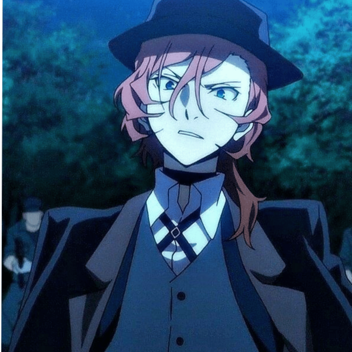 Otoya is a tall and handsome young man who has short, flat white hair with a strand of hair in the middle that is dark green, along with the underside of his hair being that same dark green color. His face is slim with a chiseled chin and thin, low-lidded eyes that are dark in color.