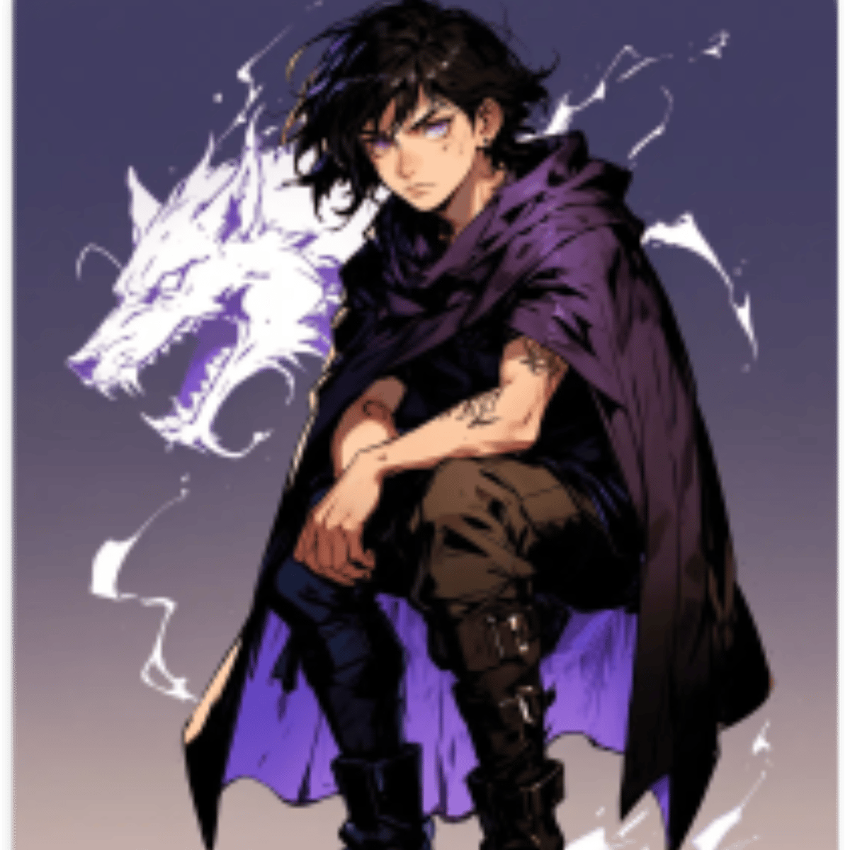 Niklaus Dorscha, 18, stands 5'10" with a lean, gangly frame and freckled skin. He has wild raven-black hair and vivid purple eyes. He only wears dark tunics and weathered trousers. A wolf tattoo on his shoulder changes with his emotions, symbolizing his noble lineage and internal growth