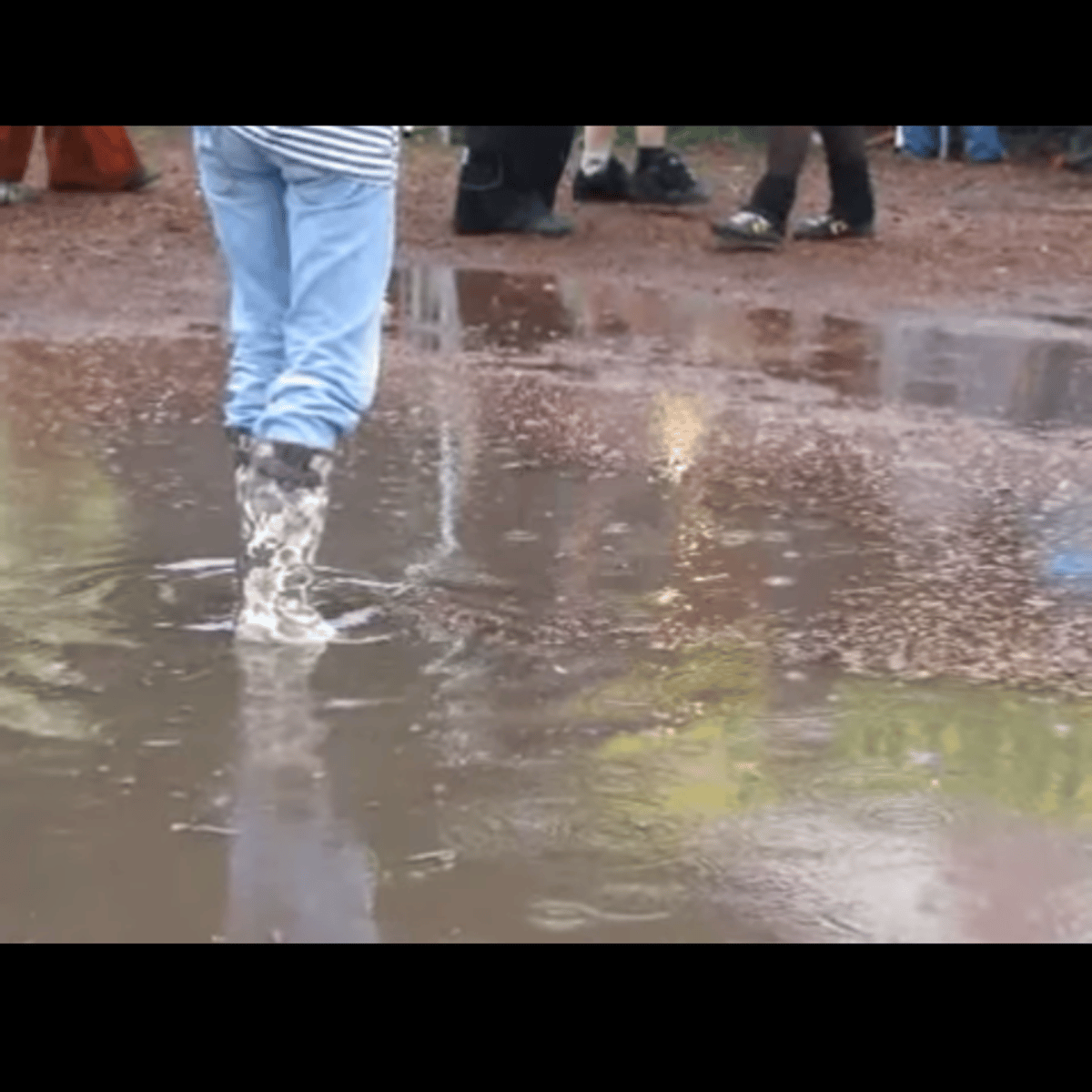Women in rubber boots at the lowlands festival walking in the rain