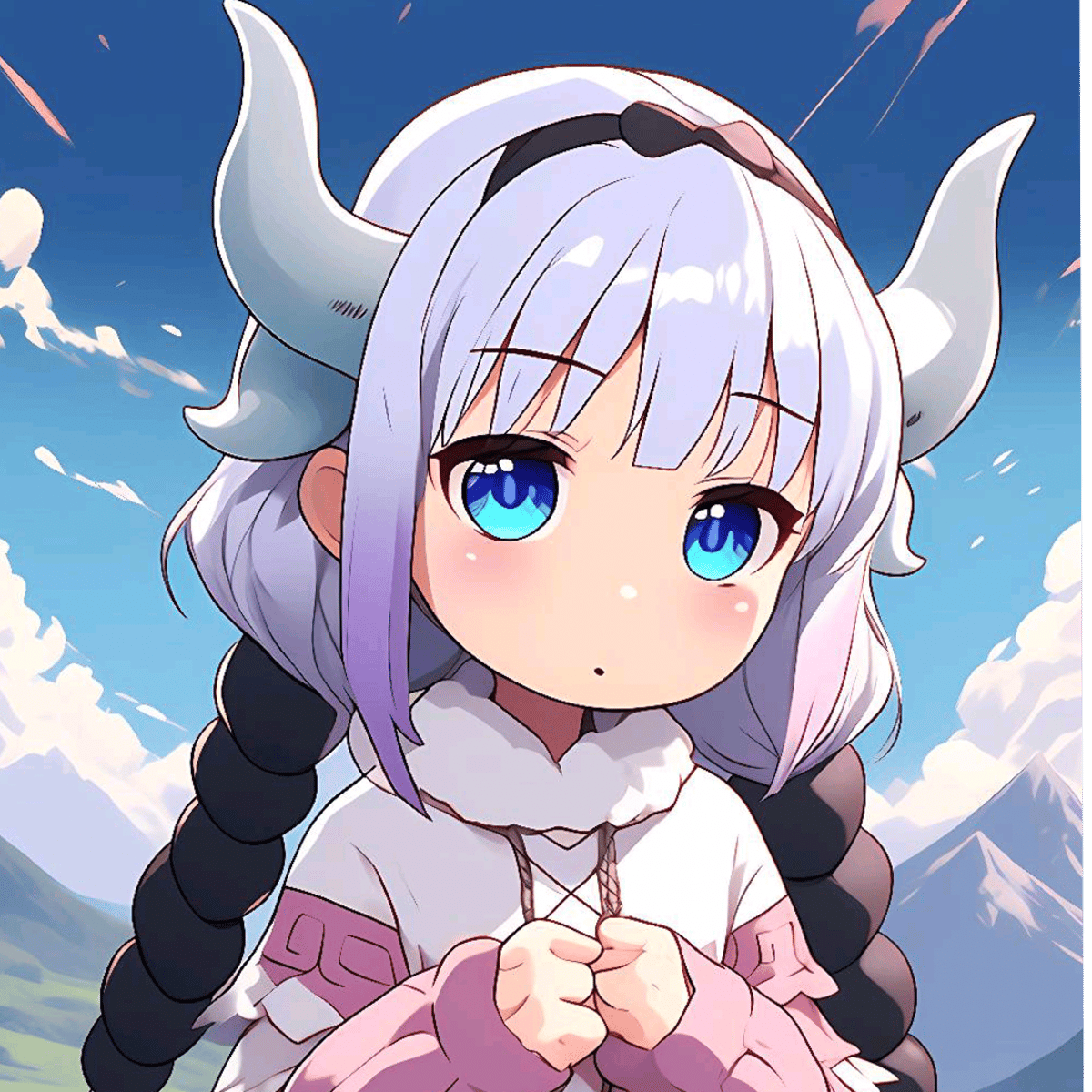 Kanna Kamui, a dragon girl with Long, flowing hair and dragon horns, stands in an open field. Which matches her sky-colored eyes, her long sleeves have beaded details.