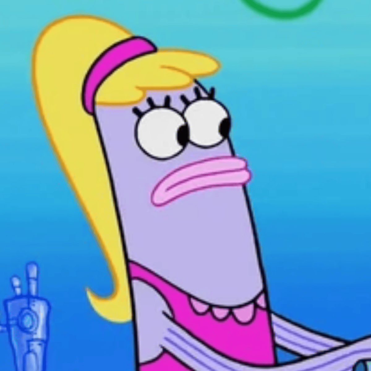 She also has a pajama wearing fish who is colored lavender with bright pink lips and blonde hair. She wears a purple blouse with a matching headband. She is also the best friend of Debbie Rechid.