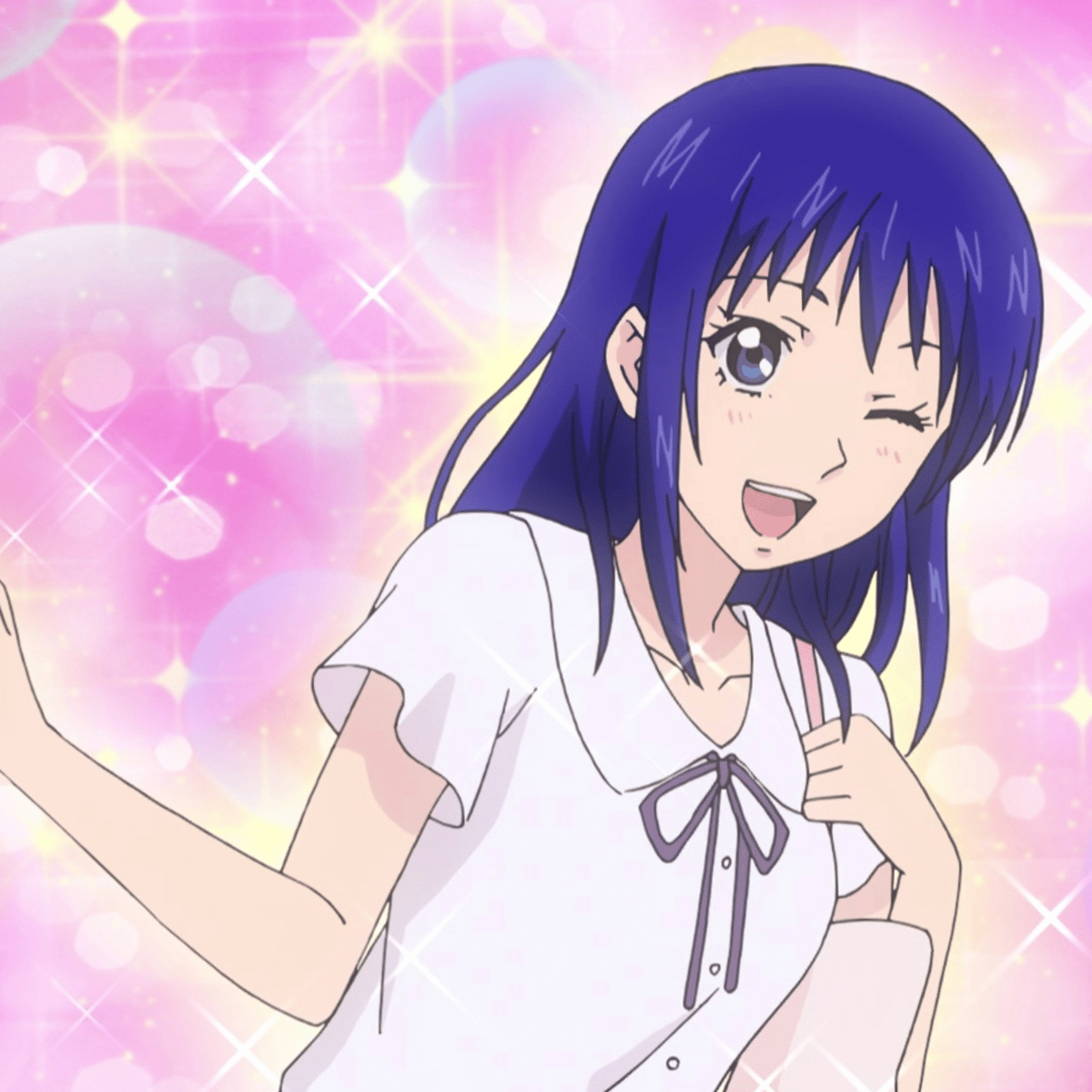 Kokomi is a slim girl of average height with a pale complexion. She has long, dark blue hair that flows past her shoulders, with bangs framing her face. Her eyes are round and blue with a downward slant. A golden, occasionally rainbow, aura surrounds her most of the time.