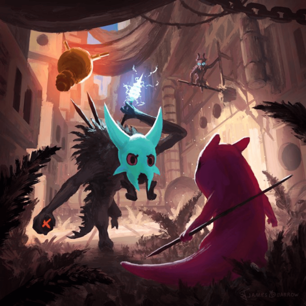 A small group of Scavengers, Scavs are widespread tribal creatures that are likely seen in groups. They are social creatures that use gestures and body language to communicate with one another, and they are capable of carrying and utilizing weapons in a manner similar to a Slugcat.