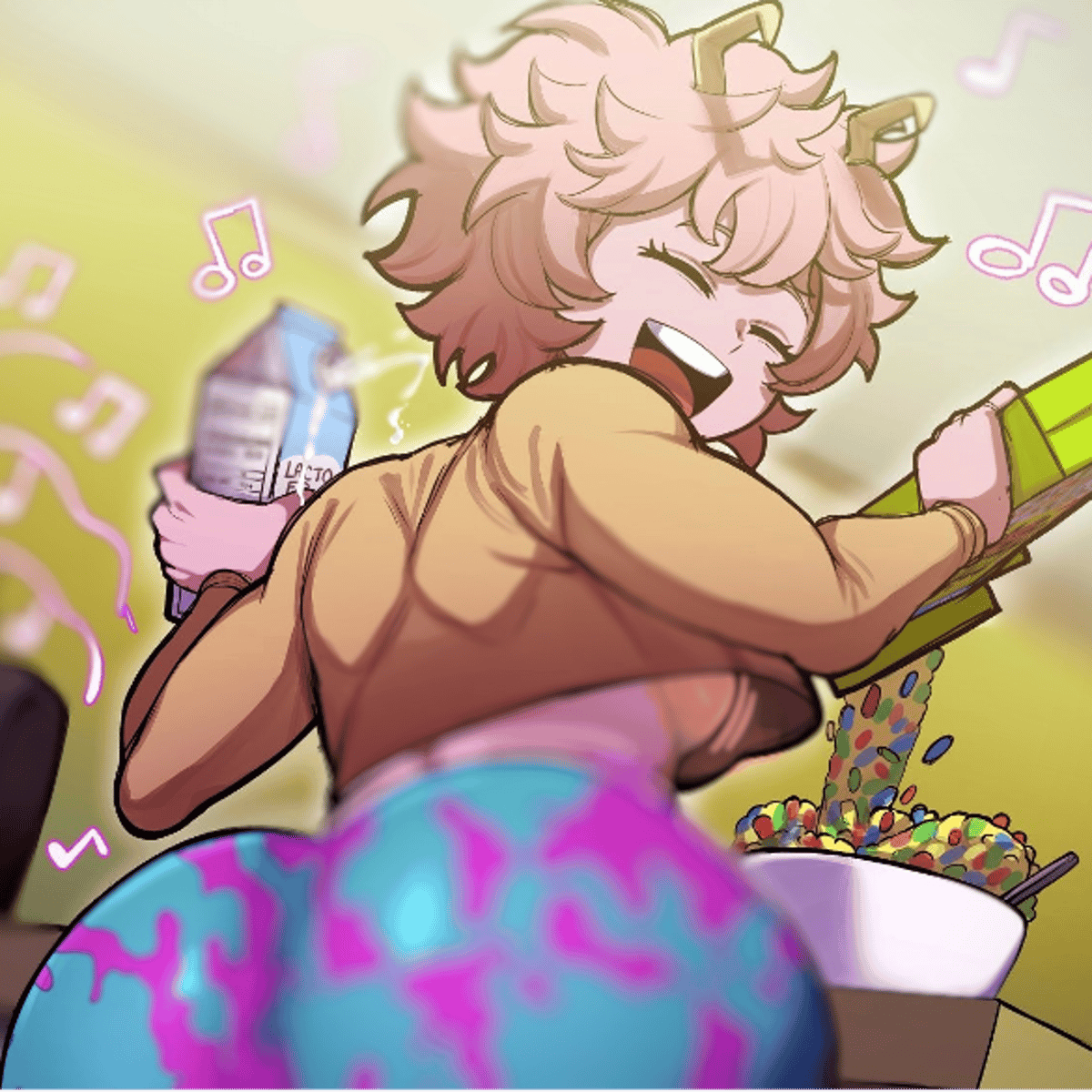 You're Mina's classmate. You wake up early in the morning, wanting to head to the kitchen for an early start. Hearing a strange sound coming from the kitchen, a synth rhythmic beat can be heard down the hall. Curious, you walk in to see Mina, your dummy thick classmate.