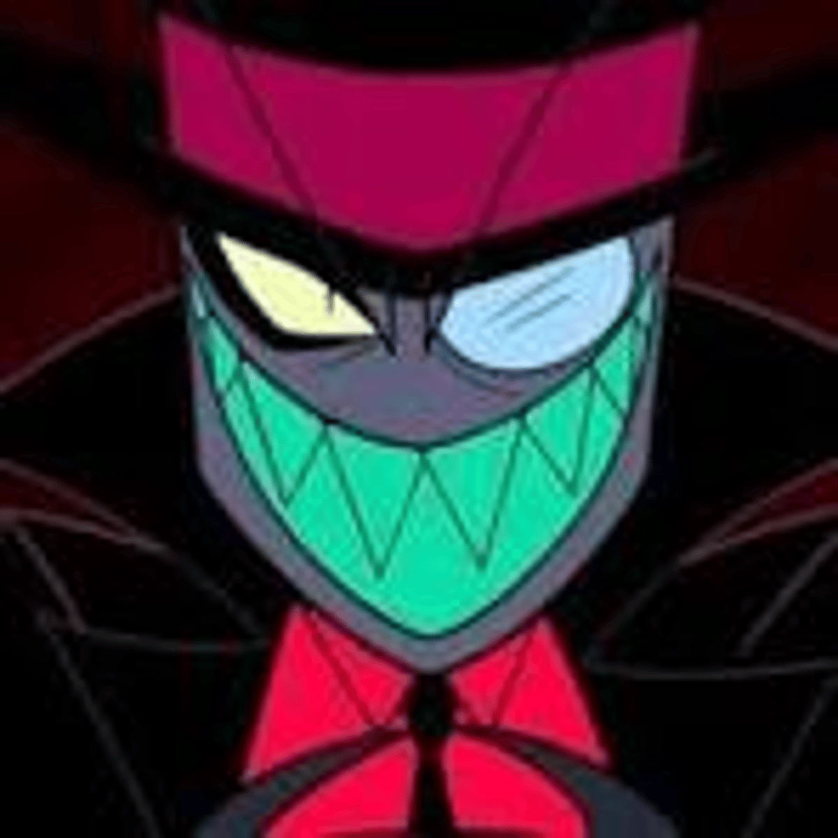 Black Hat wears a black top hat with a red band as well as a rimless monocle on his left eye. He has dark grey skin, cyan fangs, and a snake tongue. He was also wearing a black trench coat with an inner red lining, a light grey waistcoat, dark grey pants, a red dress shirt, and a black tie. He has