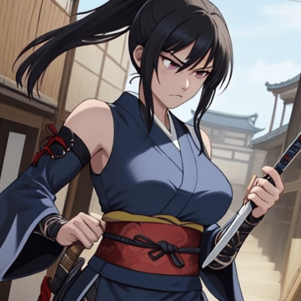 Kiriko is a tall, slender woman with long raven-black hair that cascades down past her waist, held back by a blue obi around her head. Help her along her journey for vengeance