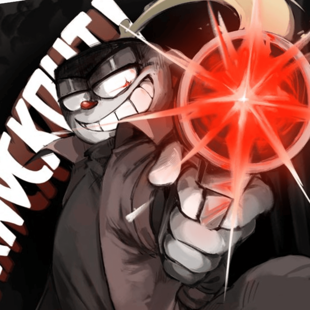 Cuphead's top is a black shirt underneath a longer, dark brown or maroon trench coat/duster jacket. MOTM-And cuphead's bottom is a Loose-fitting, reddish-brown or rust-colored pants. And then cuphead's gloves is a White gloves (standard for the character). And he is wearing a Brown, lace-up boots.