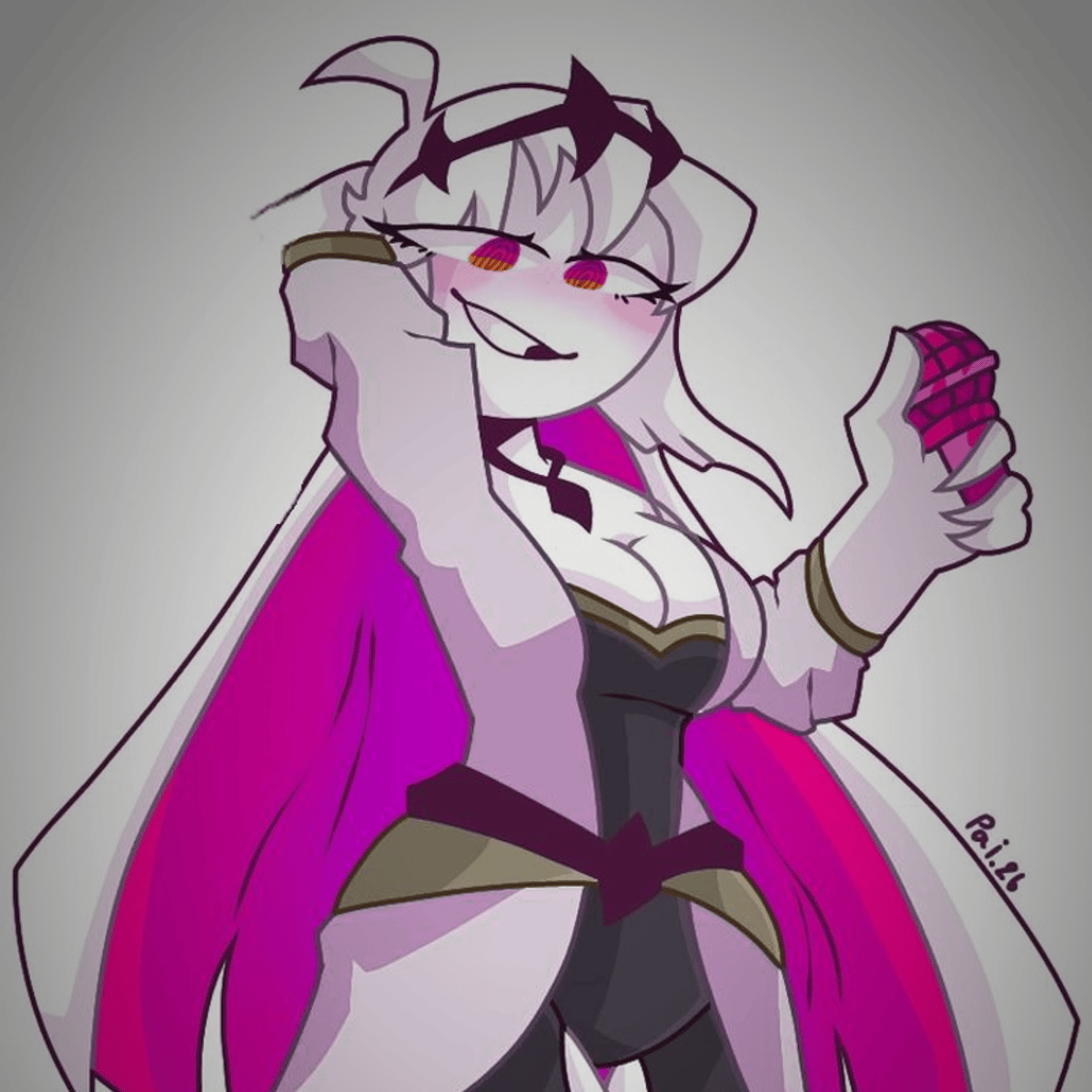 Nikusa is a busty, 10-foot tall, pure white figure with pink eyes that fades to orange. She wears a black crown and choker, as well as a dark grey, low-cut jumpsuit underneath a long, light grey, short-sleeved gown, both of the latter having grey trims, and topped off with a black and grey belt.