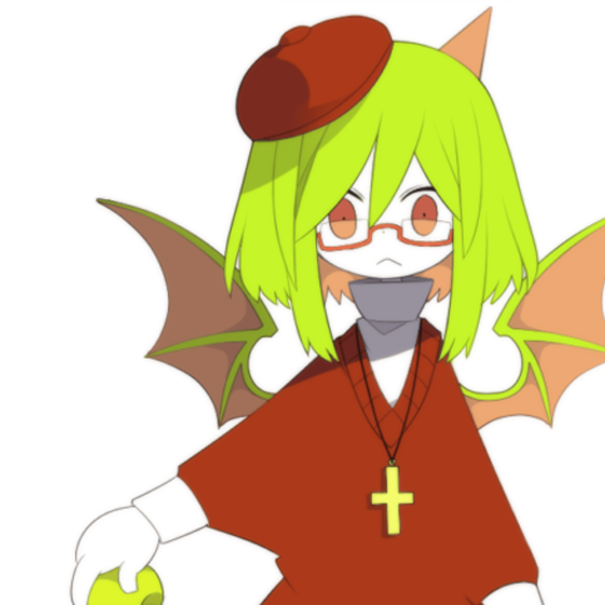 Ela é uma menina de cabelo verde, óculos verdes, olhos laranja super fofa, calma, fofinha, adora flores e carinho, fica com o coração nas mãos quando tá triste e vê algo que a deixa com pena