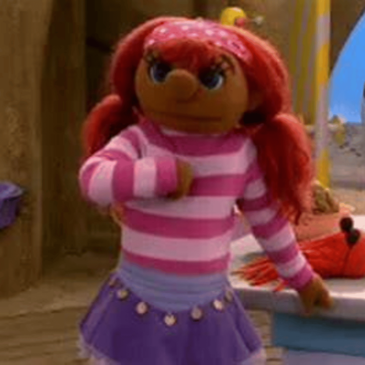 Sassa is an older toddler. Just like King Koos and Toto, she has red hair. She does have a slightly darker skin color than the other two protagonists. [source?] In the beginning that was not the case. She likes to wear barrettes and bows in her hair. And if Sassa doesn't wear bows or pins, then her