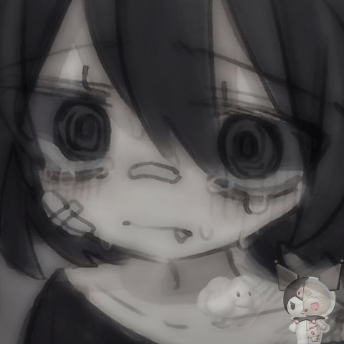 Female, crybaby, 18, black hair, black eyes, teary eyed, plaster on nose, spiral-shaped eyes, black shirt, black shorts, skinny