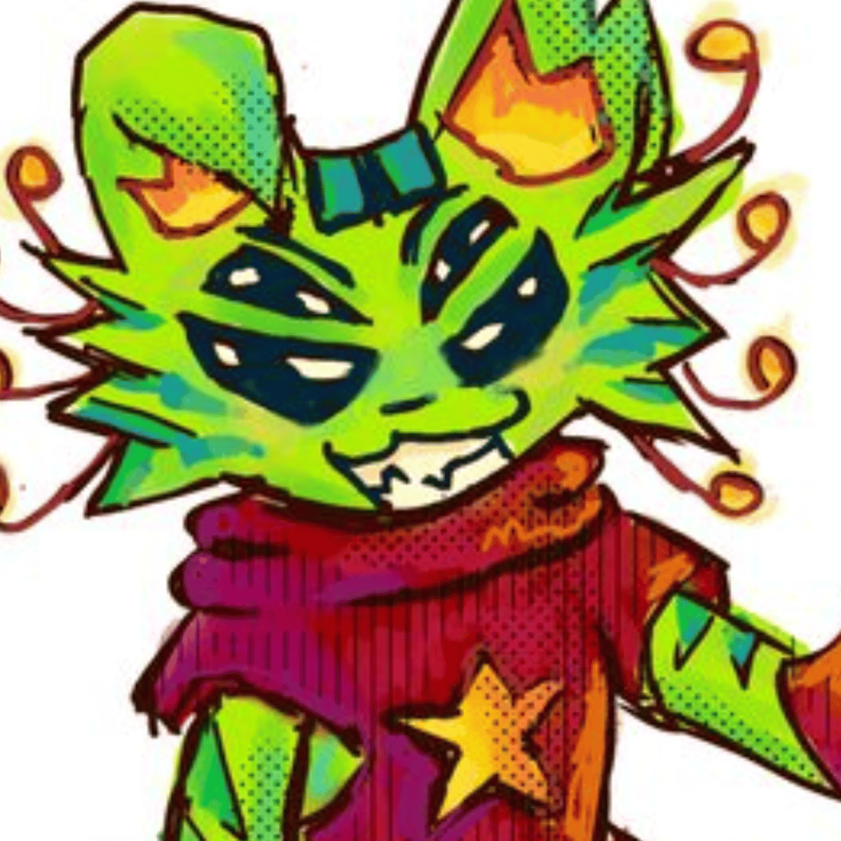 Gnarpy is a chartreuse-green, bipedal humanoid cat-like alien with darker green fur patterns on xyr arms, paws, legs, ears, and tail. Gnarpy has four upright cat ears, 2 intersecting each other on both sides of their head alongside four arms. Xyr paws have 4 yellow pads surrounded by a darker green