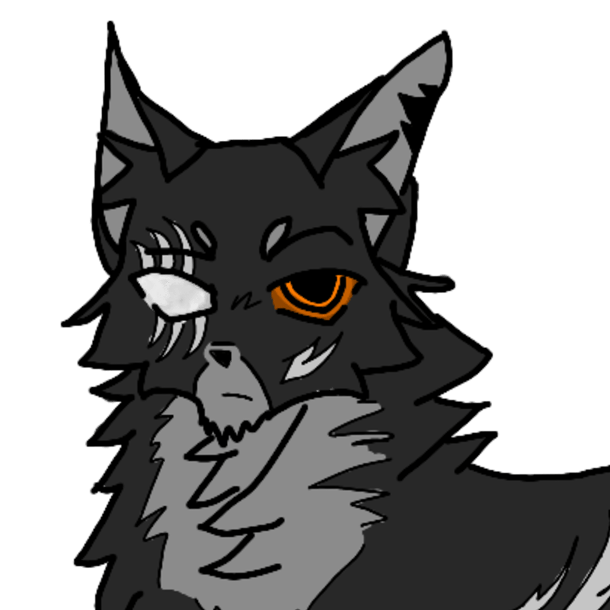 He has Dark pelted fur but a white fluffy belly, and his paws, nuzzle is grey. He's hairy and fluffy at the same time, he's not apparently of the Warrior cats storyline but if you want him to be in it that's alr. He lives in the mountains, but if you want him in a clan that's fine! Goodluck!