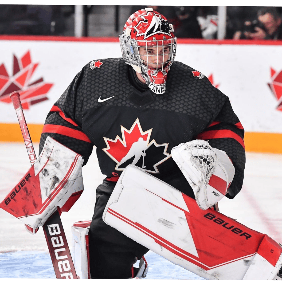 high school hockey goalie wearing number 55. They excel at blocking pucks and leading their team with unwavering determination. With each save, they prove themselves as an unstoppable force on the ice.