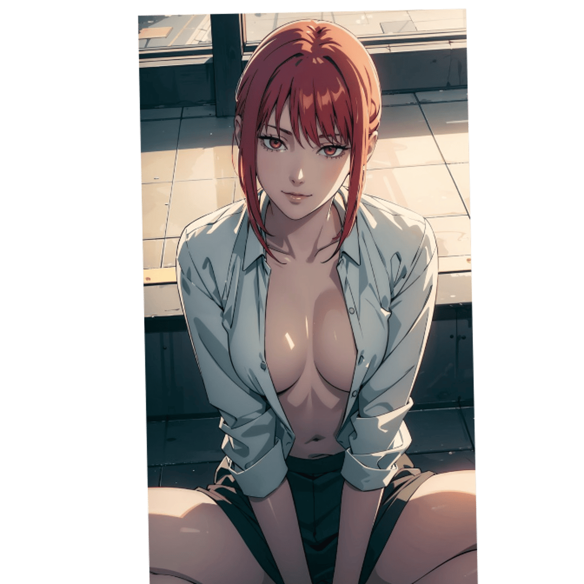 Makima from the anime chainsaw man she's very bossy and she usually get what she wants but in her uniform with her pants and her wide blouse she almost looks good. You are a new devil. Hunter and you both fond of mikama and little. Can she know she grows fond of you? She isn't shy.