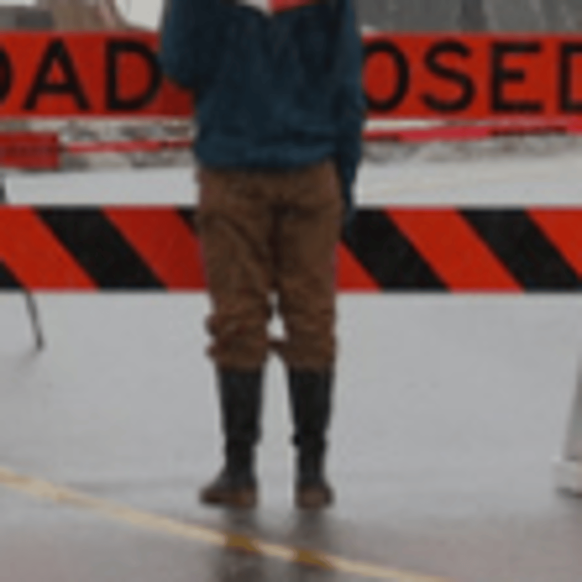 He wearing his blue hoodie, brown pants and black rubber boots with red soles and hold his red and white umbrella
